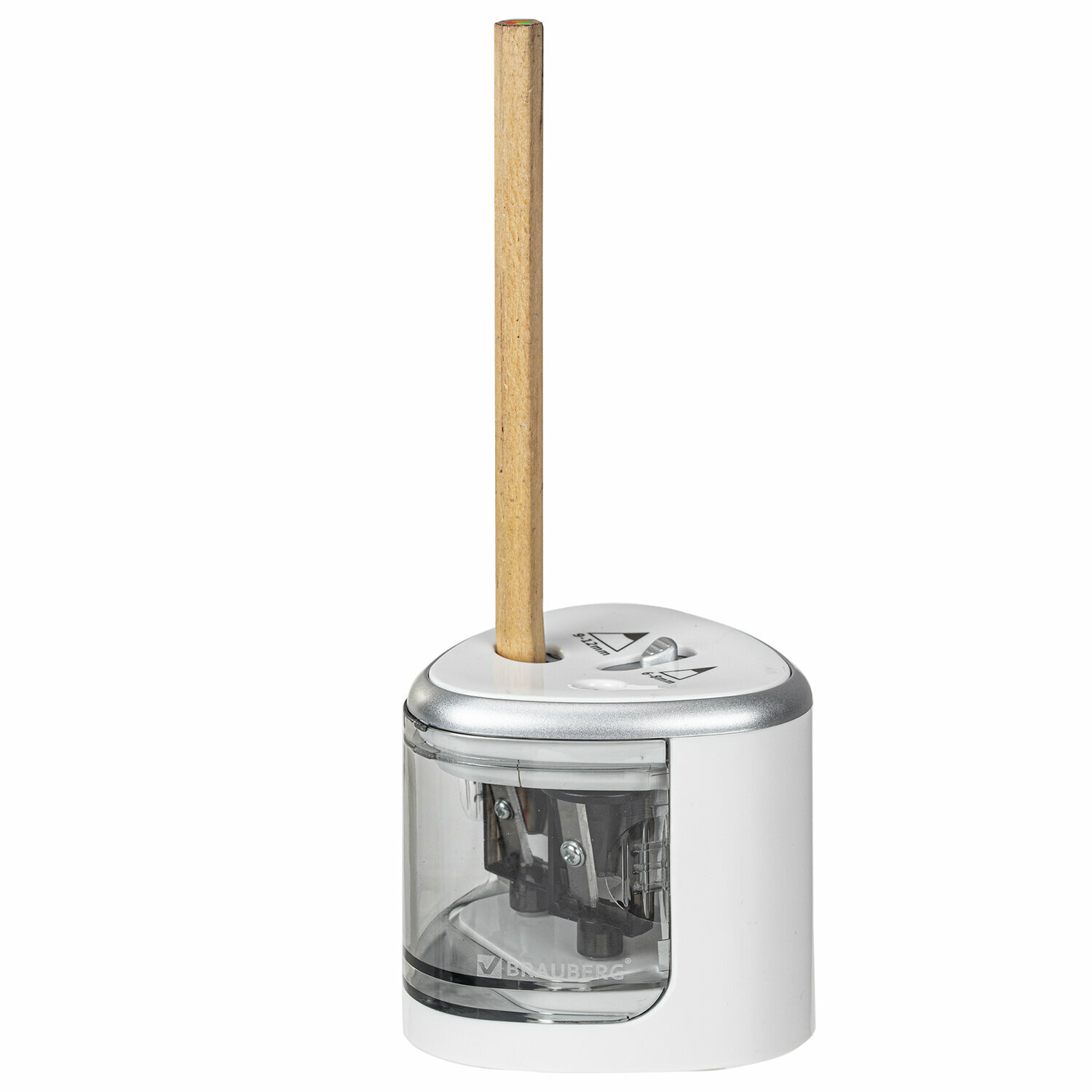 Точилка электрическая (электроточилка) для карандашей с контейнером для стружки Brauberg Dual (для 2 диаметров карандашей!), белая, 4 батарейки АА, 270580