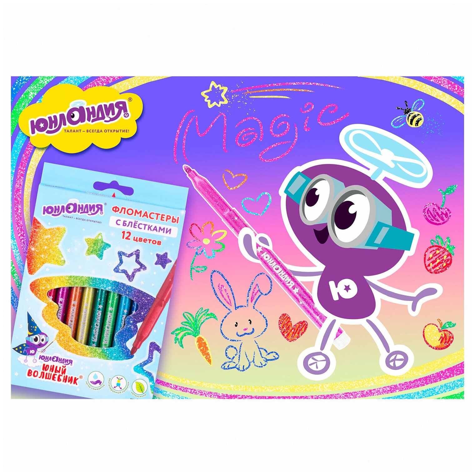Фломастеры с блестками для рисования для детей набор Юнландия 12 цветов, Юный Волшебник, ударопрочный наконечник, вентилируемый колпачок, картон информация: