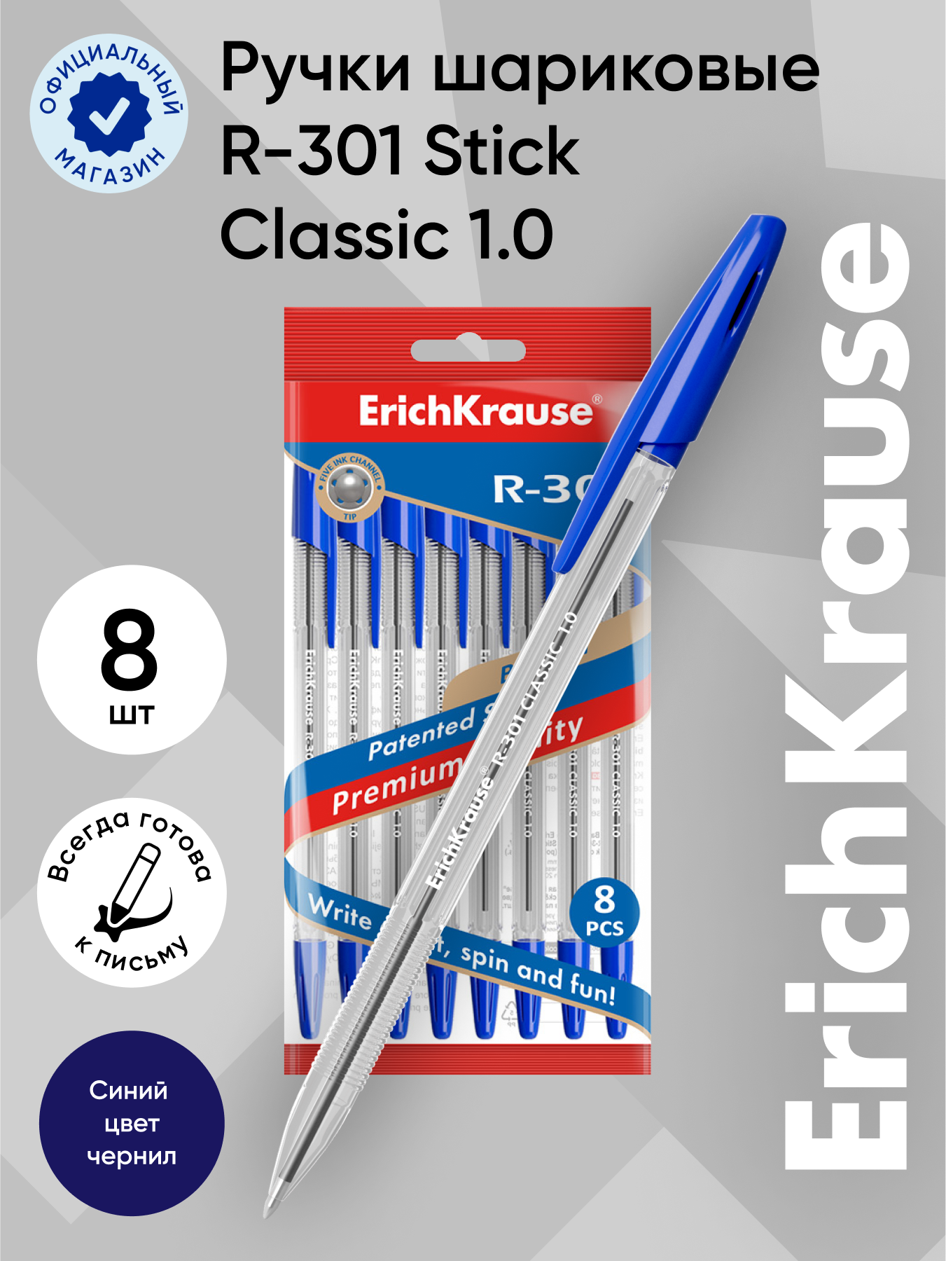 Ручка шариковая ErichKrause® R-301 Classic Stick 1.0, цвет чернил синий (в пакете по 8 шт.) информация: