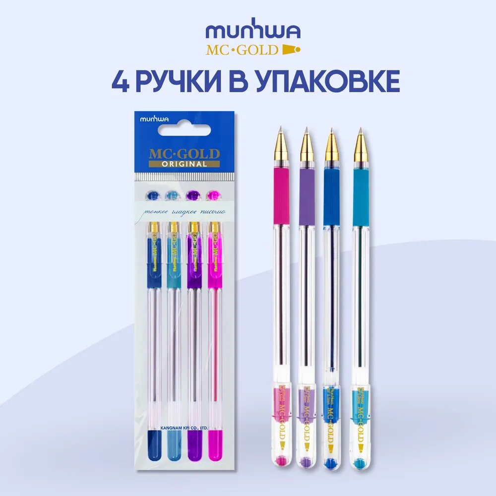 10 цен на Набор шариковых ручек MunHwa "MC Gold 4цв., 0,5мм, св.-синяя, син, фиолет, фуксия, пакет с европодвесом
