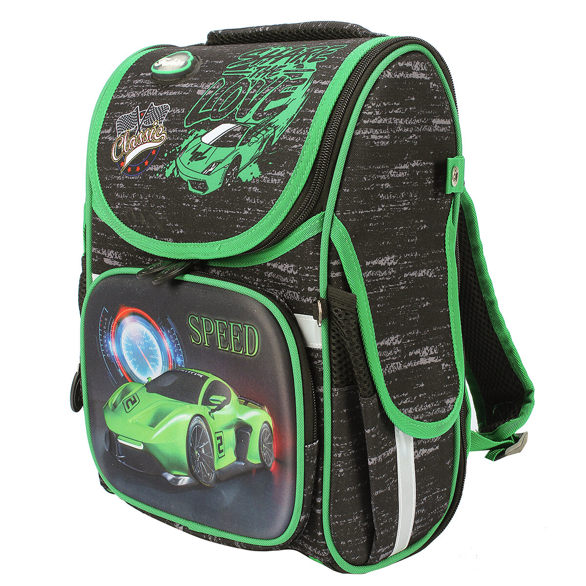 Рюкзак ранец портфель "Автомобиль" 25х14х33 см школьный для первоклассника, 1 отдел, боковые карманы на резинке под клапаном, для мальчика, широкие лямки, эргономичная спинка – сетка, зеленый / 1 шт информация: