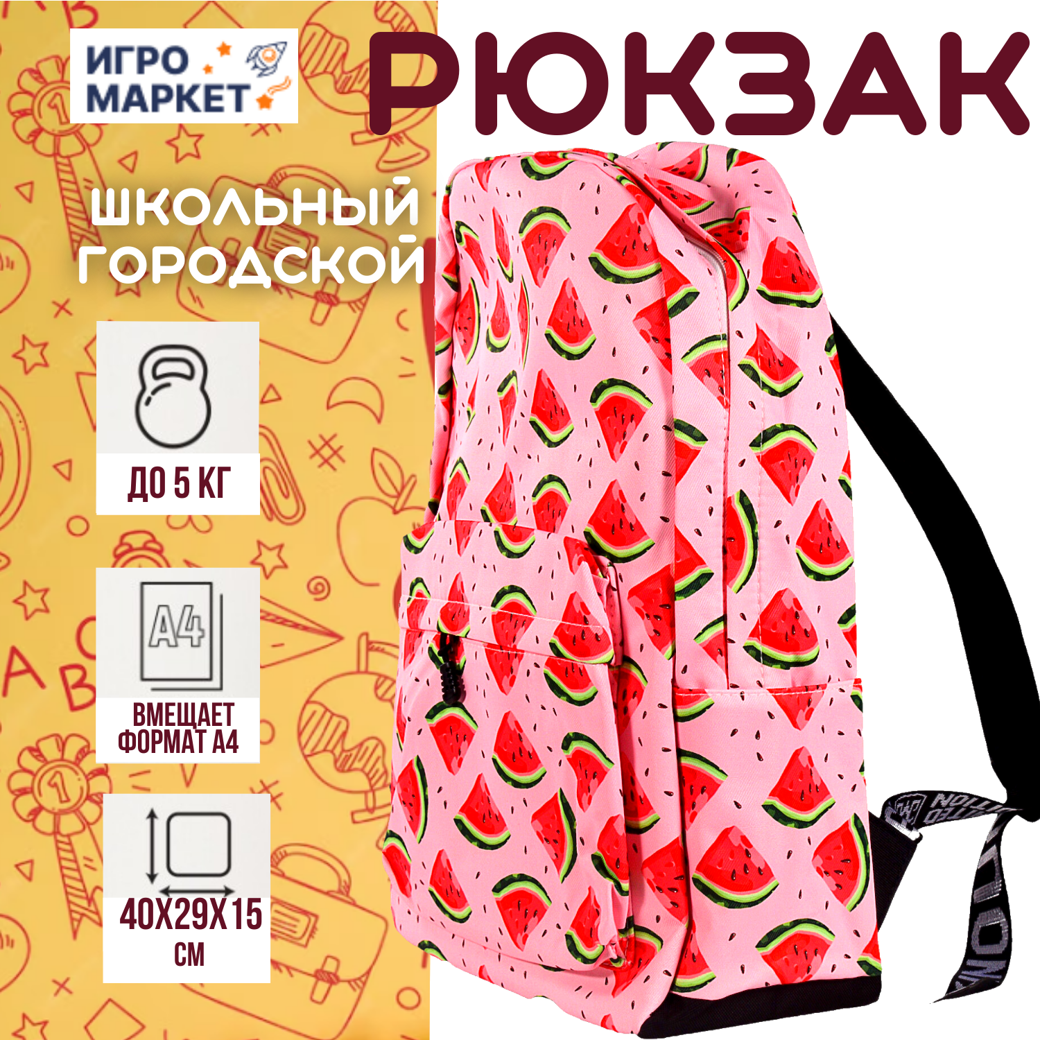 Рюкзак ранец городской "Арбузики" 40х29х15 см молодежный, 1 отдел на молнии, 1 фронтальный карман, женский, регулируемые лямки, плотный полиэстер с водонепроницаемой пропиткой,, цвет яркий / 1 шт информация: