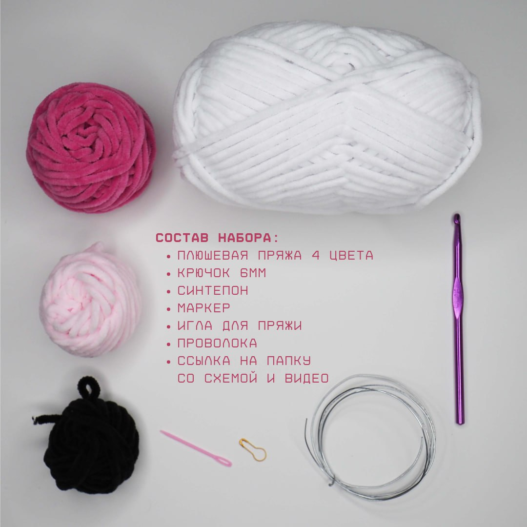 | Подробная комплектация | Пряжа, крючок, игла для пряжи, маркер, QR-код со схемой, синтепон, фурнитура |