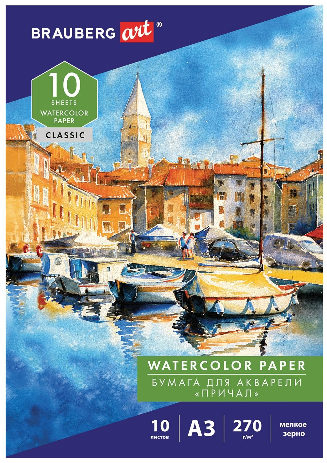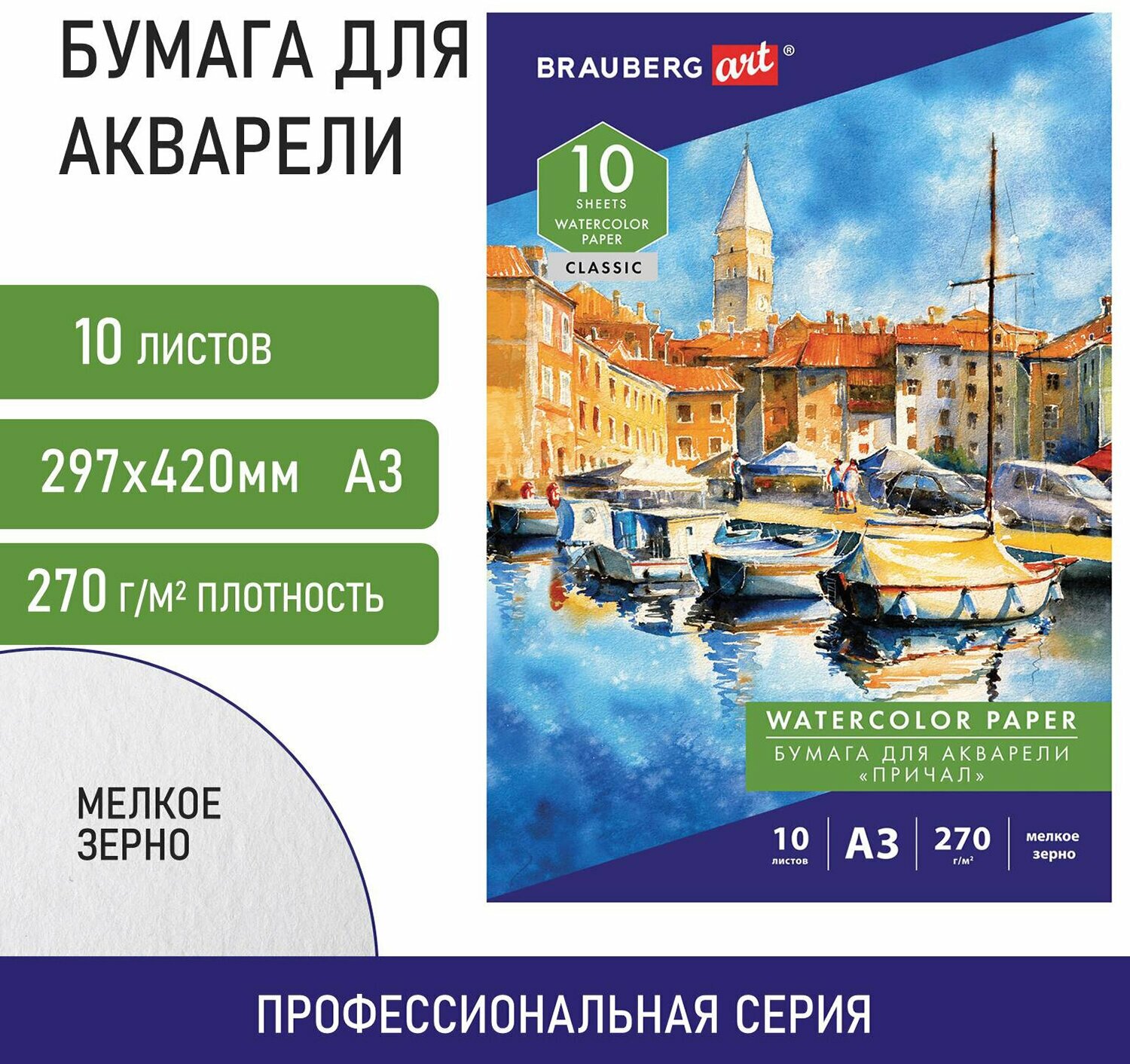 Бумага в папке для акварели для рисования Большая А3, 10 листов, 270 г/м, мелкое зерно, Brauberg Art Classic, Причал информация: