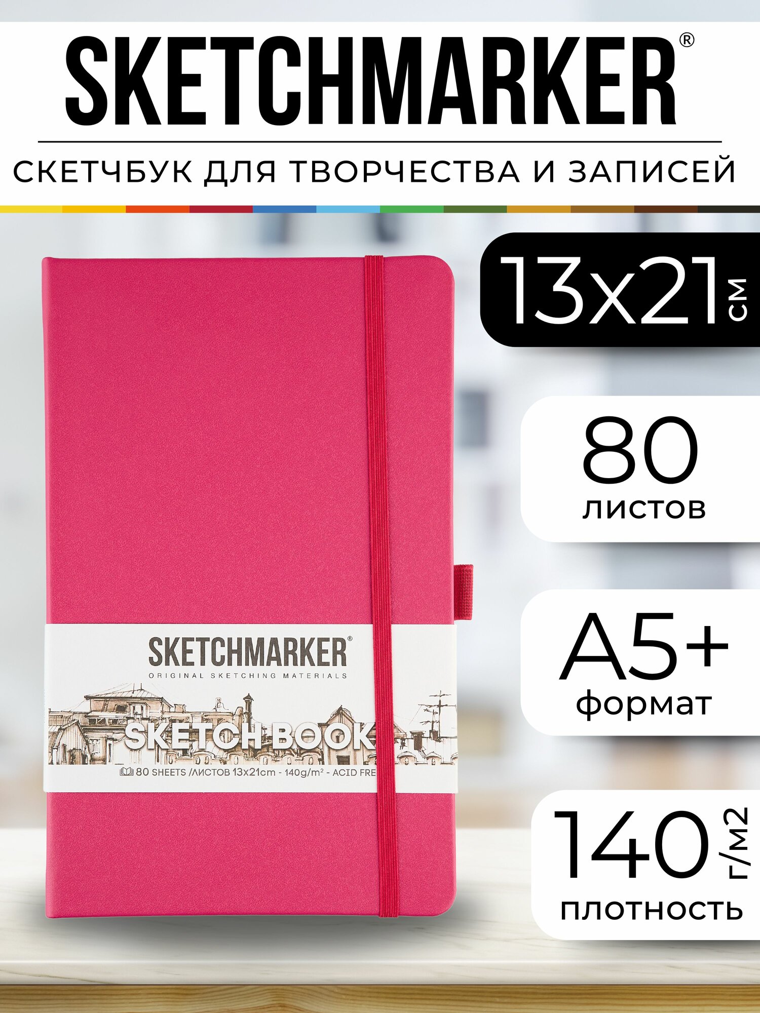 Скетчбук для рисования и скетчинга SKETCHMARKER 140г/м2 13х21см. 160 страниц цвета слоновой кости, твердая обложка, цвет: маджента информация: