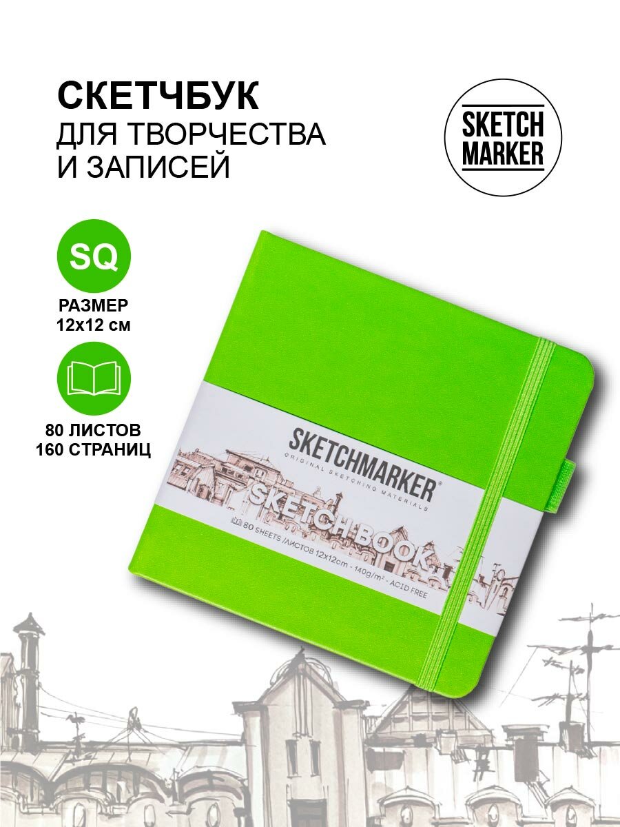 Скетчбук для рисования квадратный, блокнот для скетчинга SKETCHMARKER Sketchmarker 140г/кв.м 12*12см 80л твердая обложка, цвет Зеленый луг информация: