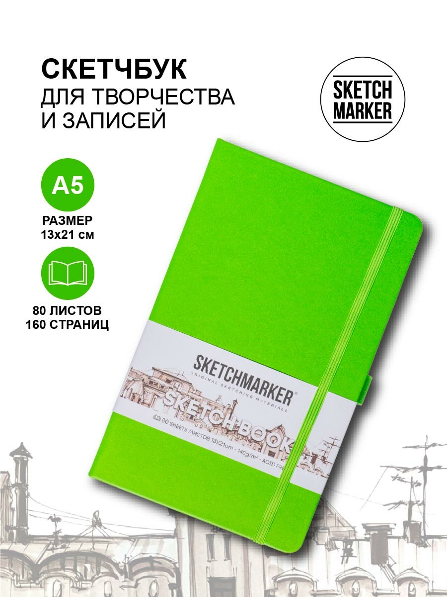 Скетчбук для рисования, блокнот для скетчинга SKETCHMARKER Sketchmarker 140г/кв.м 13*21см 80л твердая обложка, цвет Зеленый луг информация: