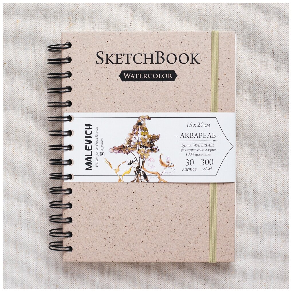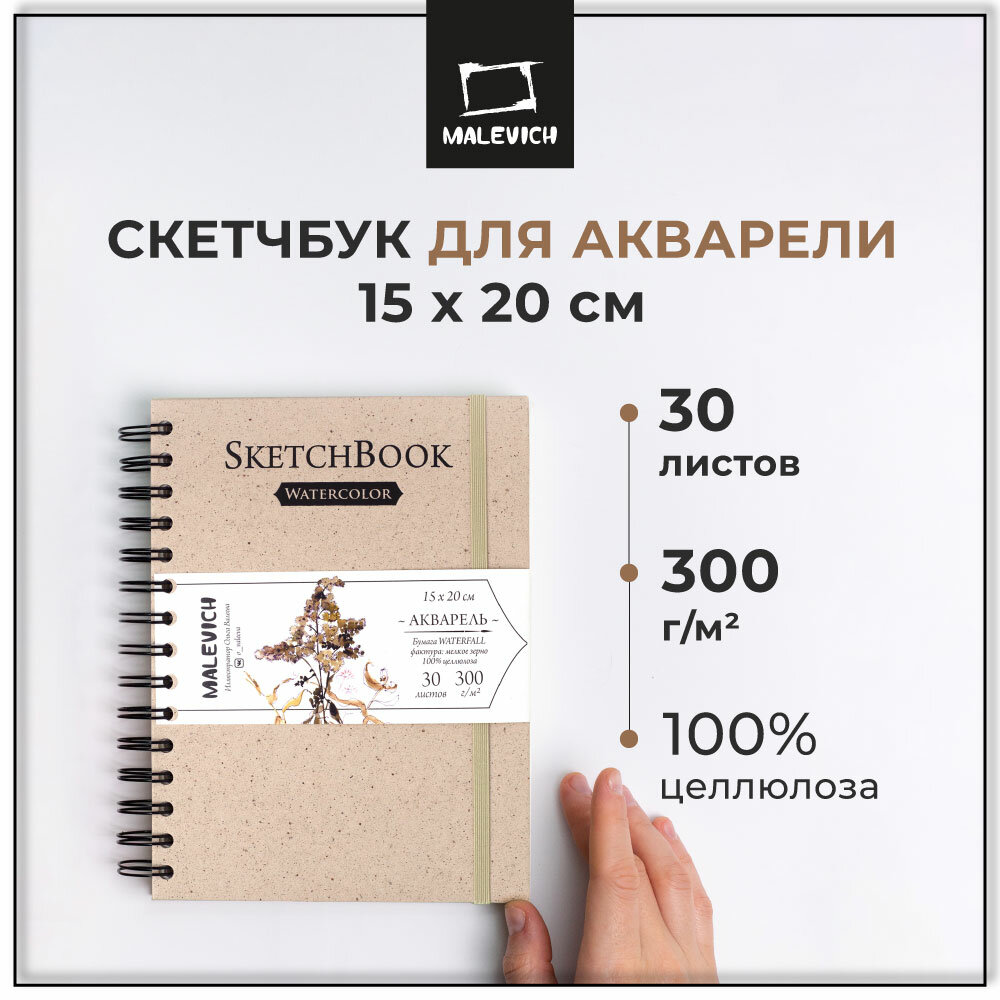 Скетчбук Малевичъ для акварели Nature, 100% целлюлоза WaterFall, спираль, бежевый, 300 г/м, 15х20 см, 30л информация: