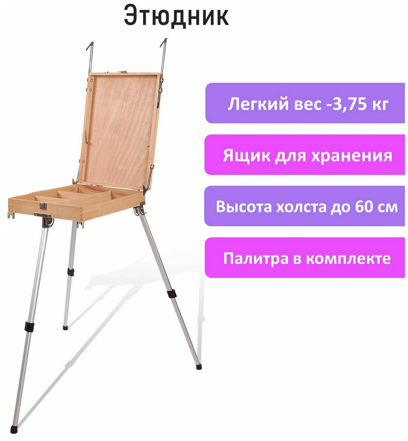 Этюдный ящик мольберт деревянный для рисования из бука настольный из бука, 47х33х8,5см, высота холста до 60см, ножки алюминий 78см, Brauberg Art информация: