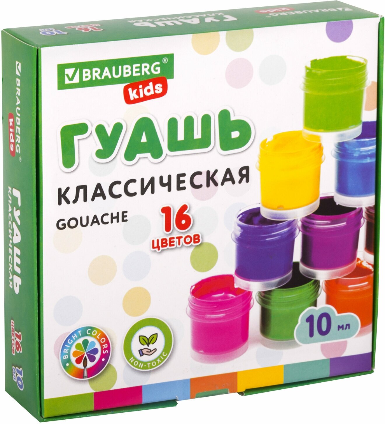 Гуашь (краска) для рисования школьная Brauberg Kids New, 16 цветов по 10 мл, 192375 информация:
