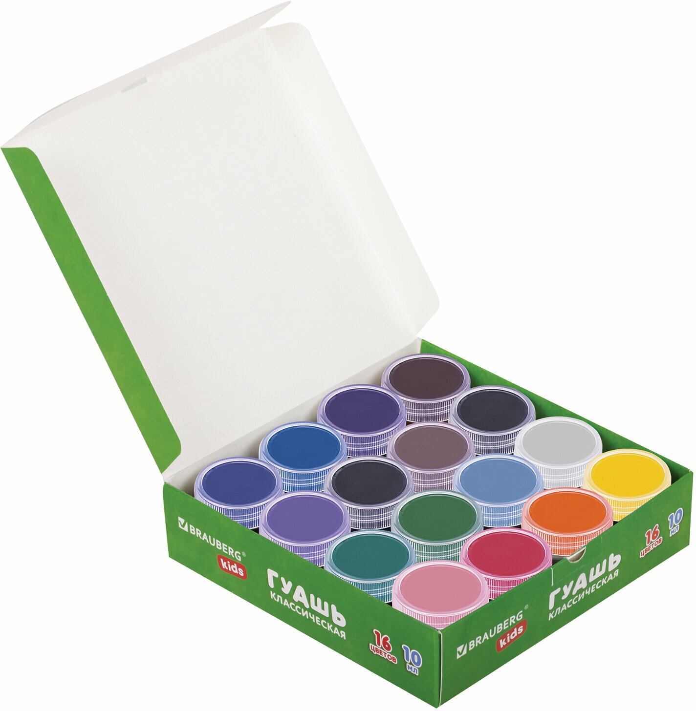 10 цен на Гуашь (краска) для рисования школьная Brauberg Kids New, 16 цветов по 10 мл, 192375