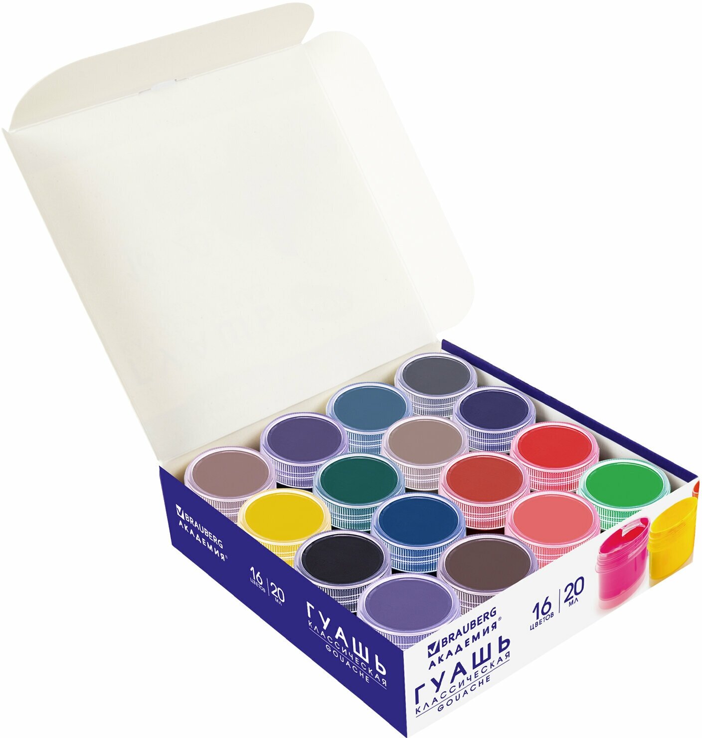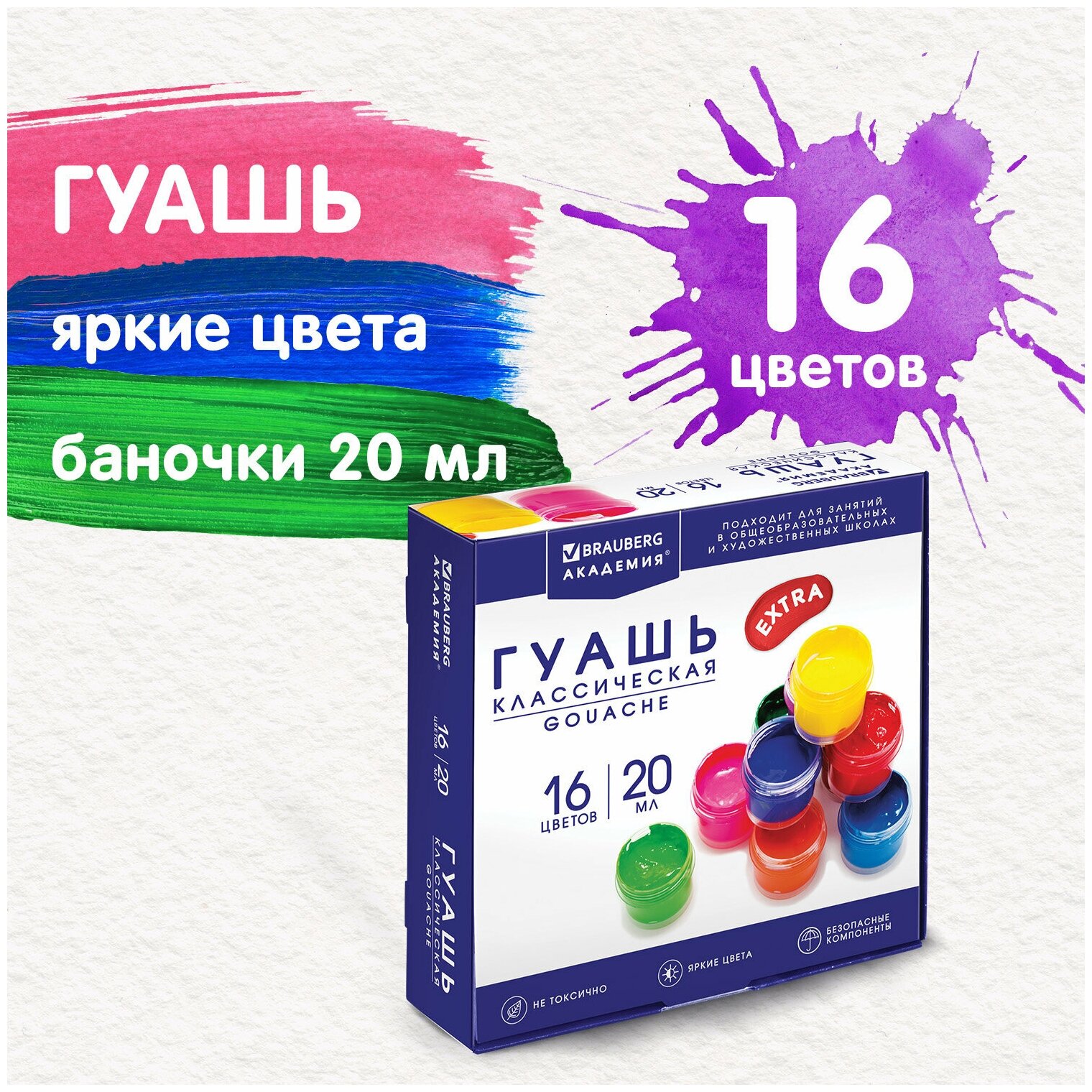 Гуашь (краска) для рисования школьная Brauberg Академия Классическая Экстра, 16 цветов по 20 мл, 192373 информация: