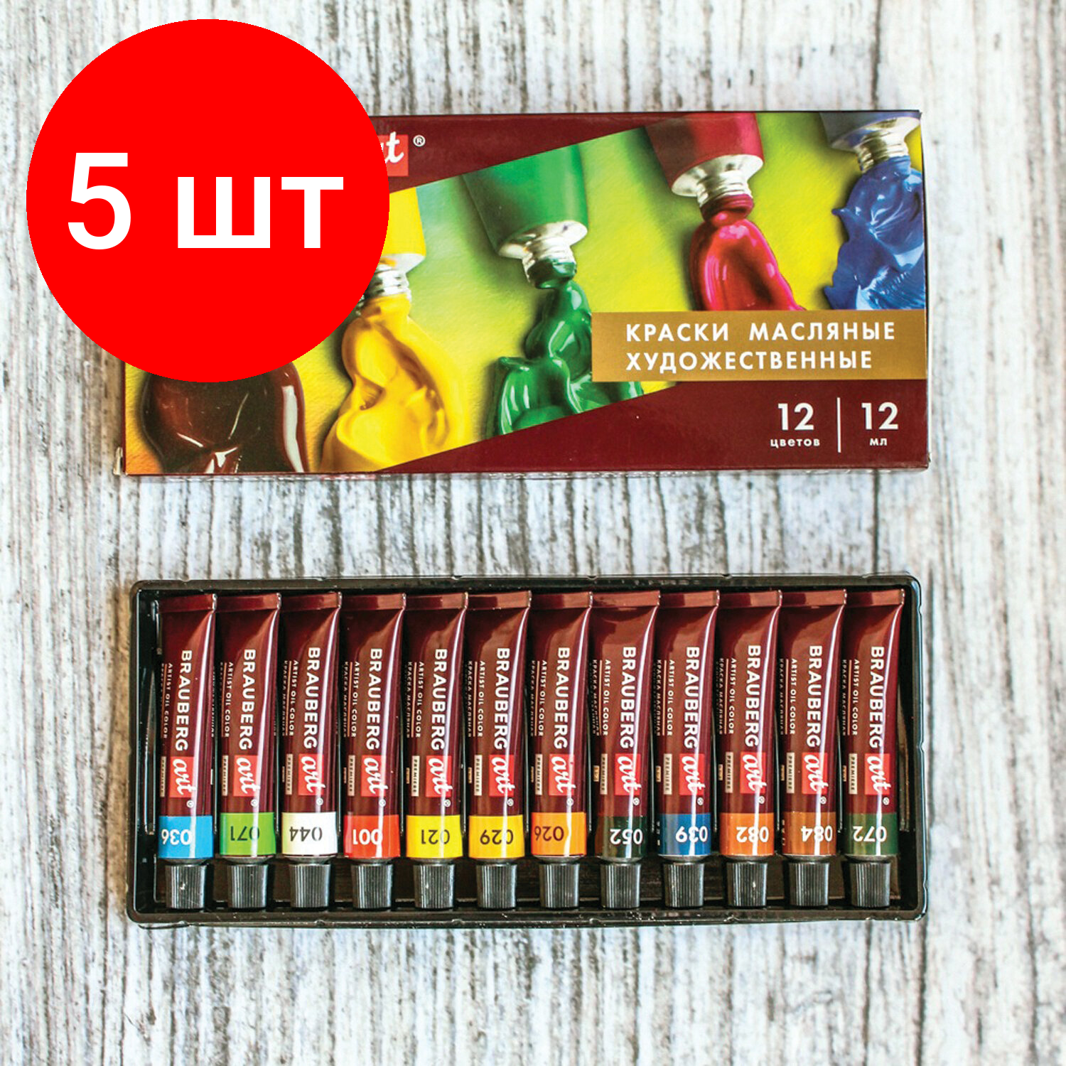 10 цен на Комплект 5 шт, Краски масляные художественные BRAUBERG ART PREMIERE, 12 цв по 12 мл, проф. серия, в тубах, 191455