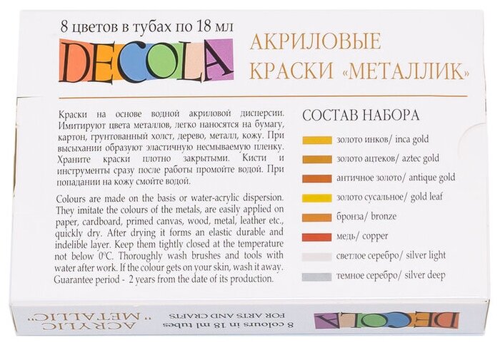 DECOLA / Акриловые краски в тубах металлик, 8 цветов по 18 мл, ЗХК Невская палитра информация: