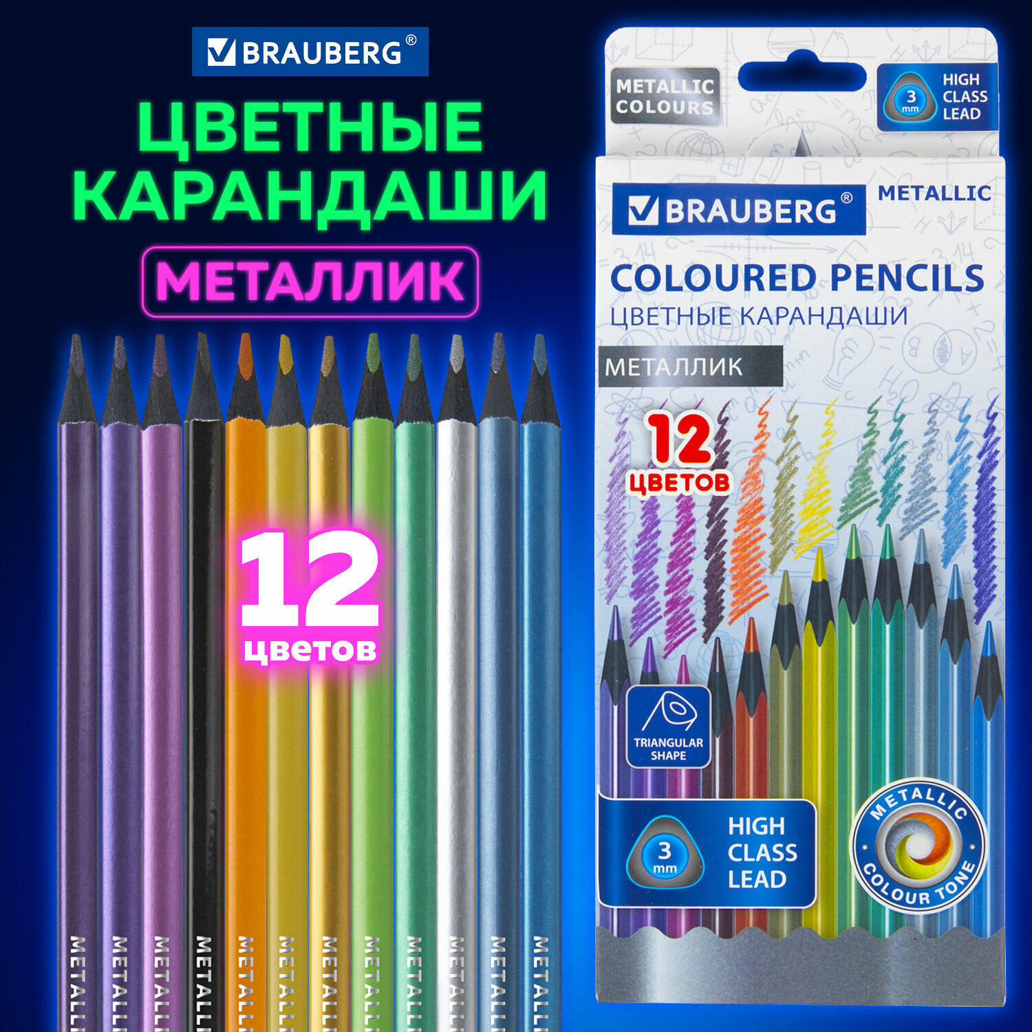 Карандаши деревянные цветные для рисования 12 цветов, Brauberg Metallic, трехгранные, грифель 3 мм, черное дерево, 181853 информация: