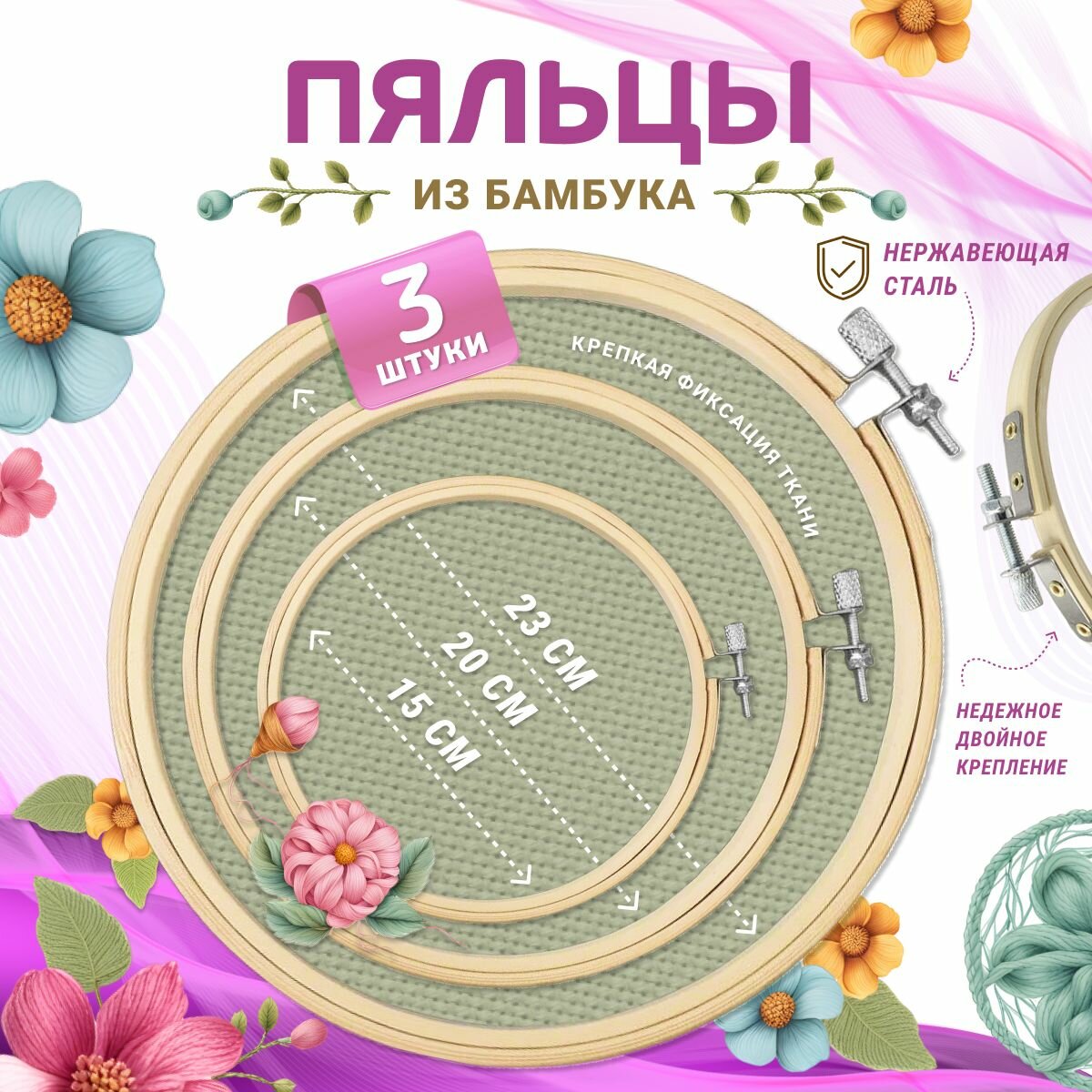 | Подробная комплектация | Пяльце 3шт диаметром 10,15,23см |