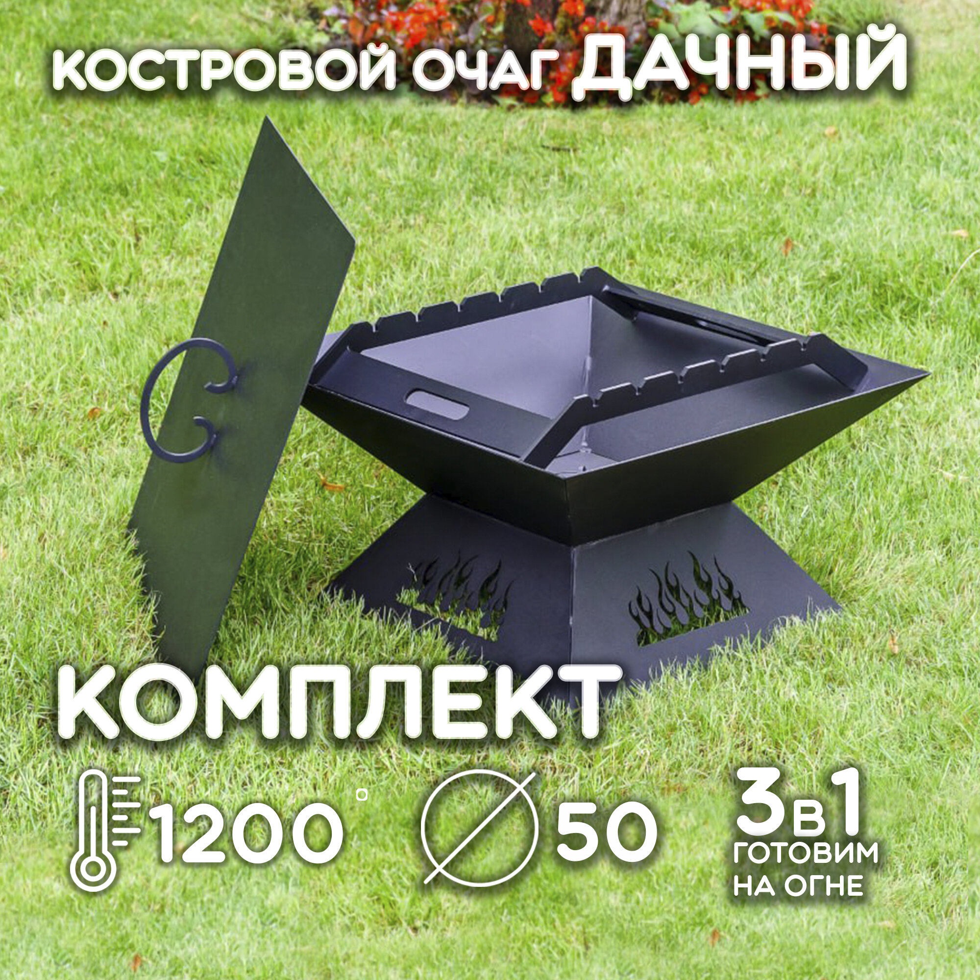 Костровой очаг Дачный 50х50 см с подставкой под шампура и крышкой / Чаша для костра FIRE-HOUSE информация: