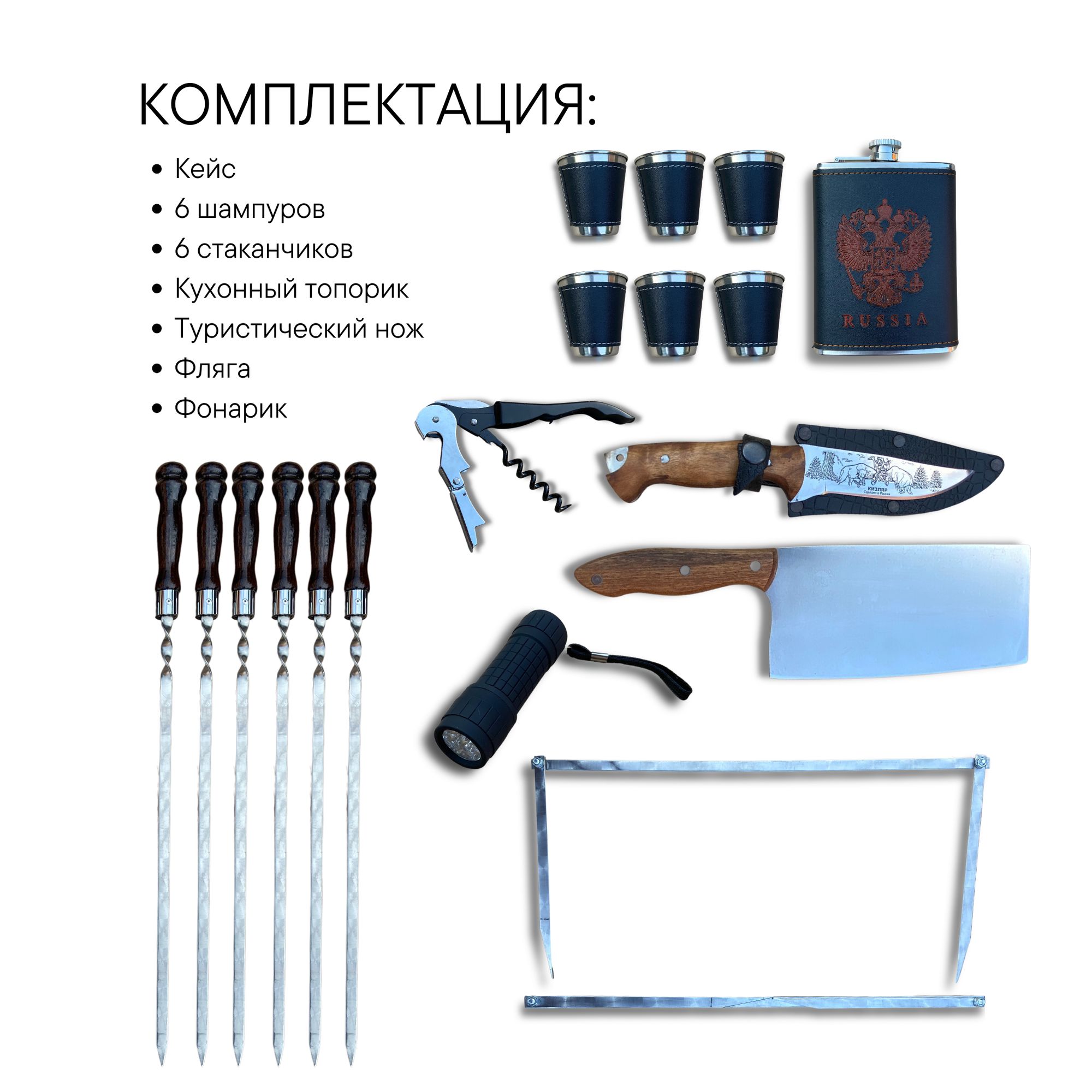 | Комплектация | шампура из нержавеющей стали 6 шт.; Мангал портативный-таганок; Нож кизлярский в ножнах; Топорик для мяса; Фляга из нержавейки; стопки набор из нержавейки 6 шт.; Фонарик; кейс для шампуров |