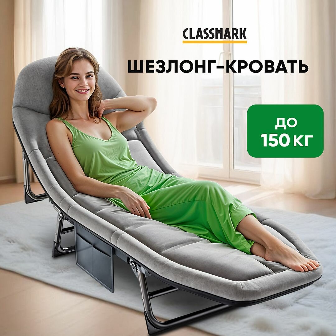10 цен на Раскладушка с матрасом и карманом взрослая туристическая CLASSMARK шезлонг для дачи складной, мебель для сада, кровать для кемпинга и туризма усиленная до 150 кг