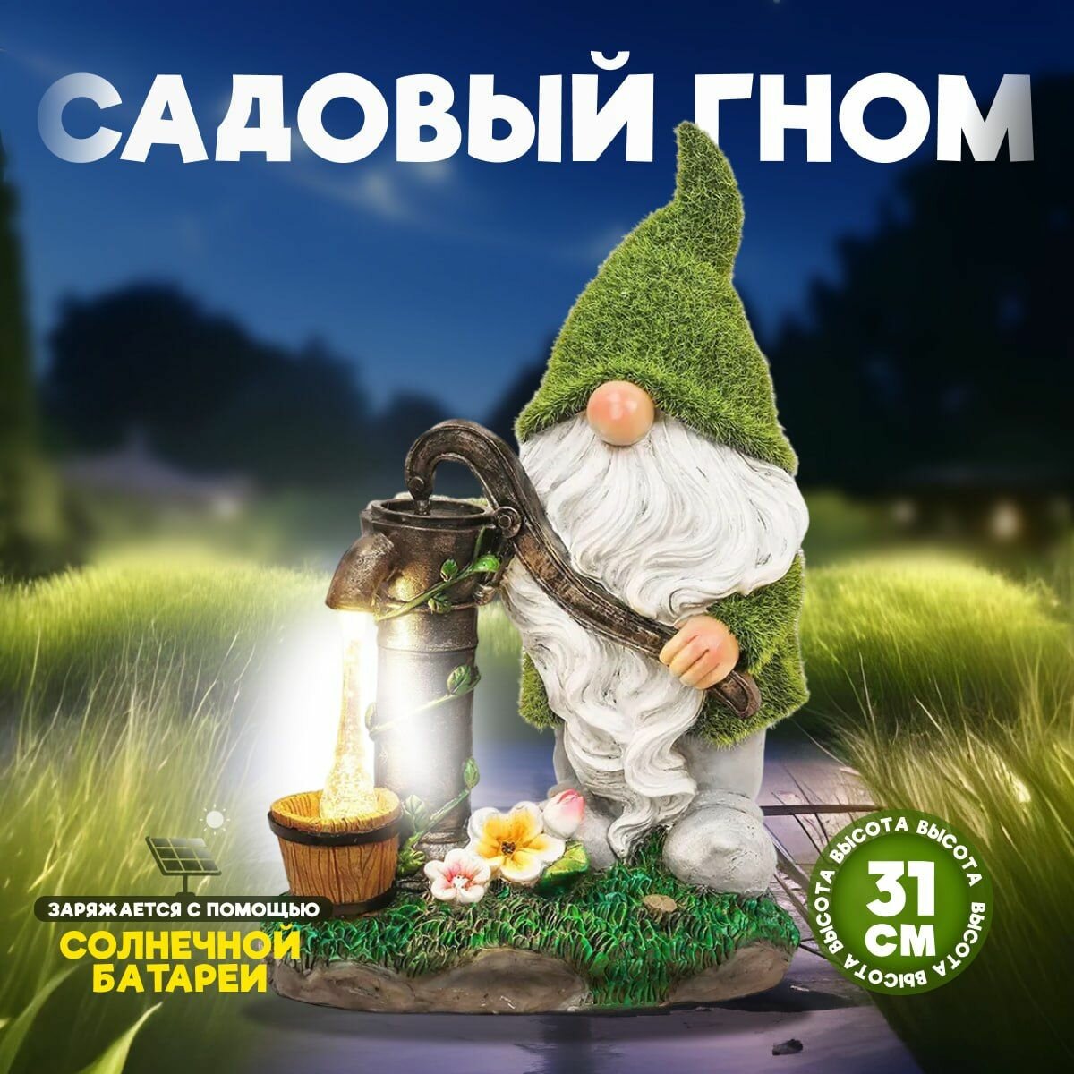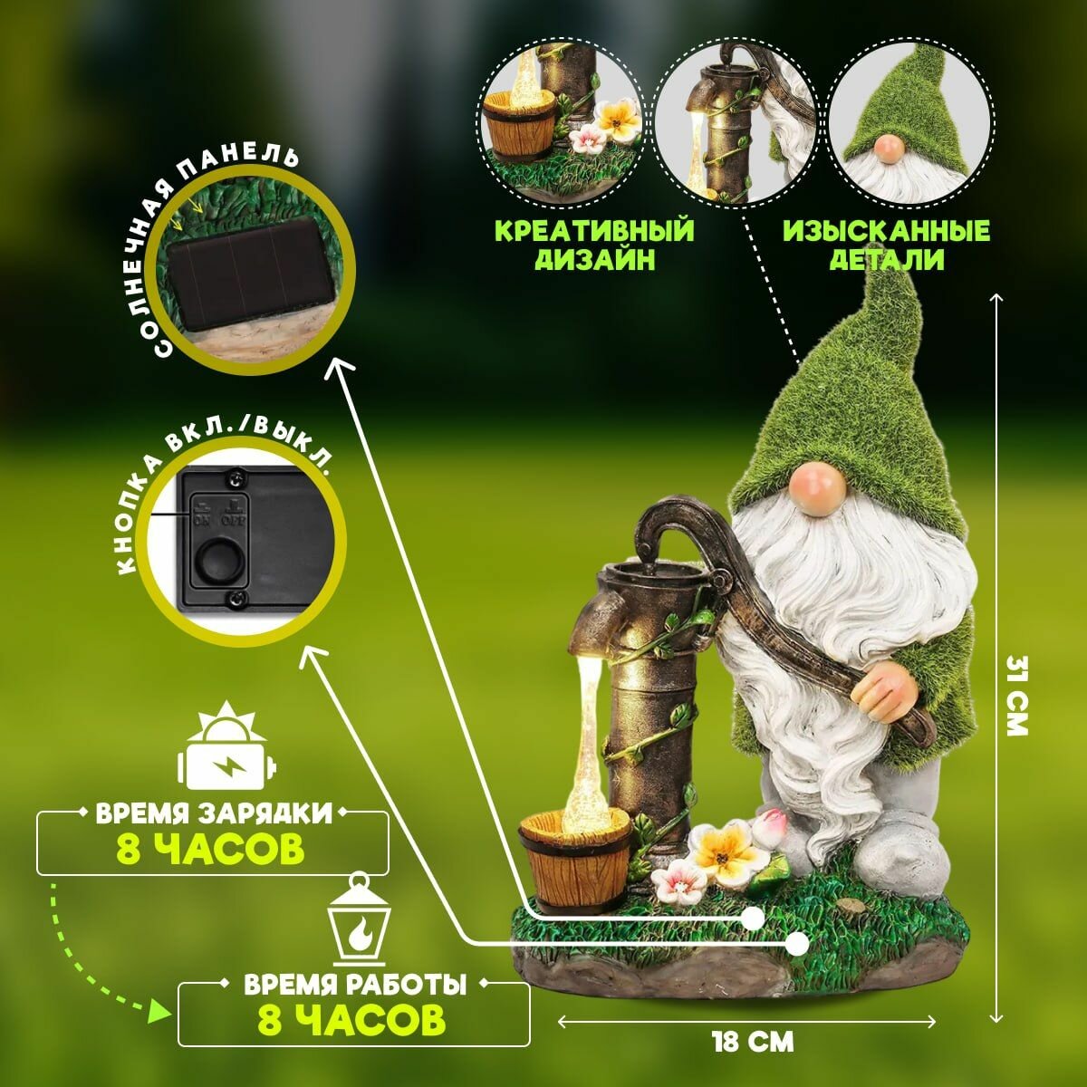 Садовая фигурка на газон с подсветкой "Гном с водяной колонкой", материал - полиэфирная смола информация: