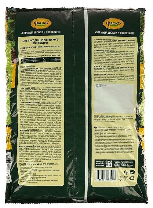 Торфогрунт Фаско БИО для органического земледелия 10 л информация: