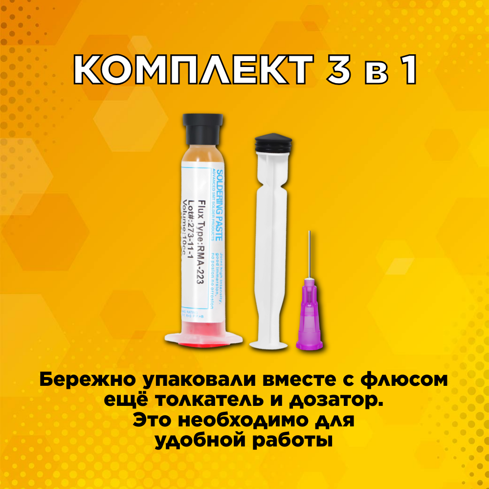 | Комплектация | 2 тюбика с флюсом, шприц-толкатель, дозатор |