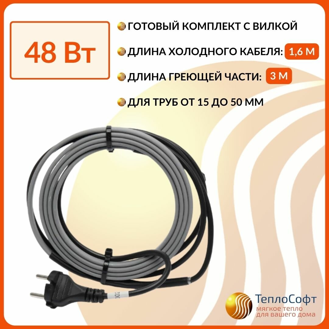 Греющий кабель на трубу саморегулирующийся 3м 48Вт / для водопровода / для водостока / обогрев труб информация: