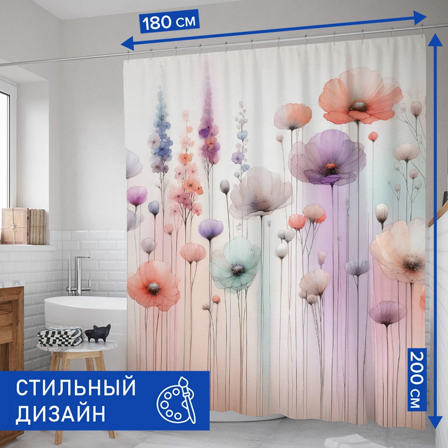 Штора для ванной, занавеска в ванную комнату тканевая "Акварельные цветы" JoyArty информация: