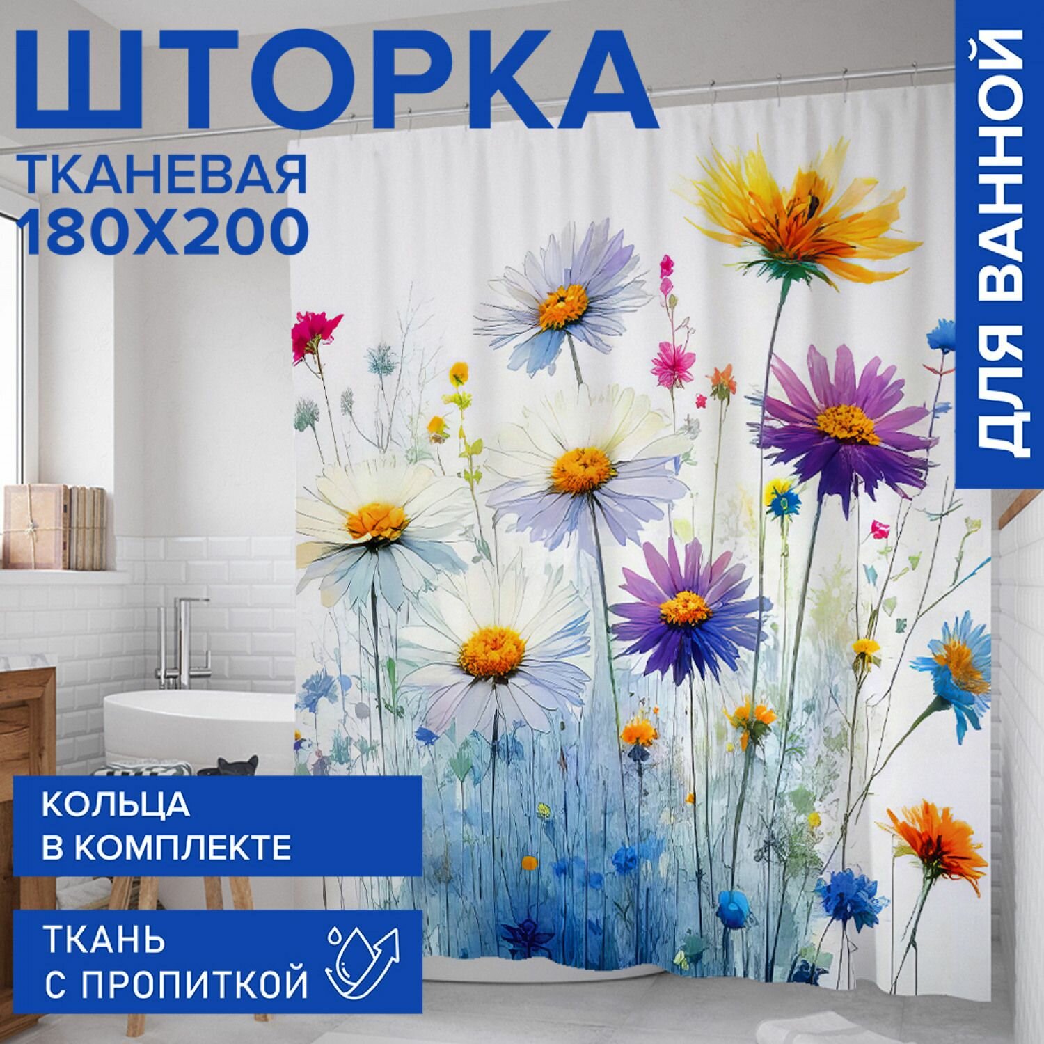 Штора для ванной, занавеска в ванную комнату тканевая "Яркие цветы" JoyArty информация: