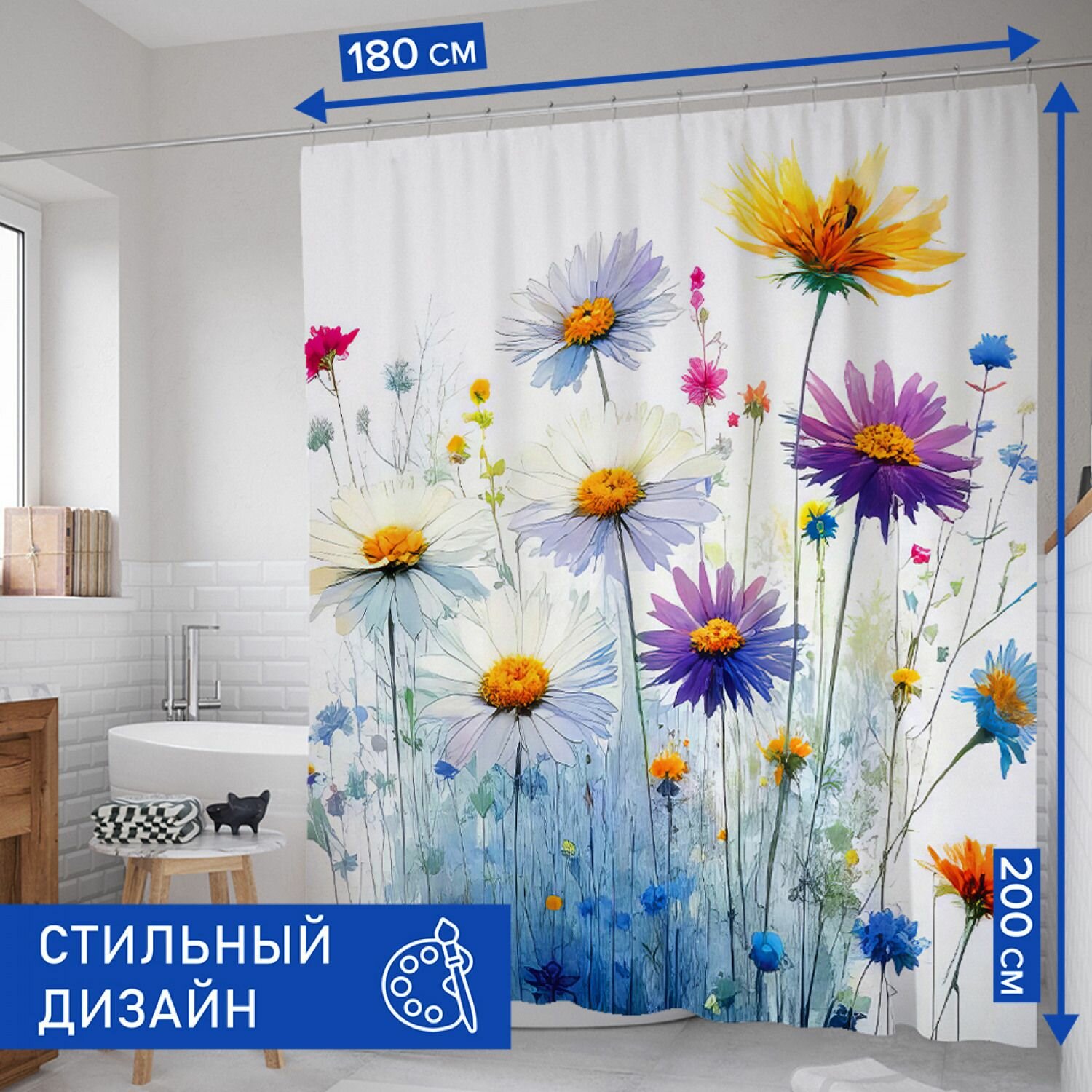 Отзывы на Штора для ванной, занавеска в ванную комнату тканевая "Яркие цветы" JoyArty