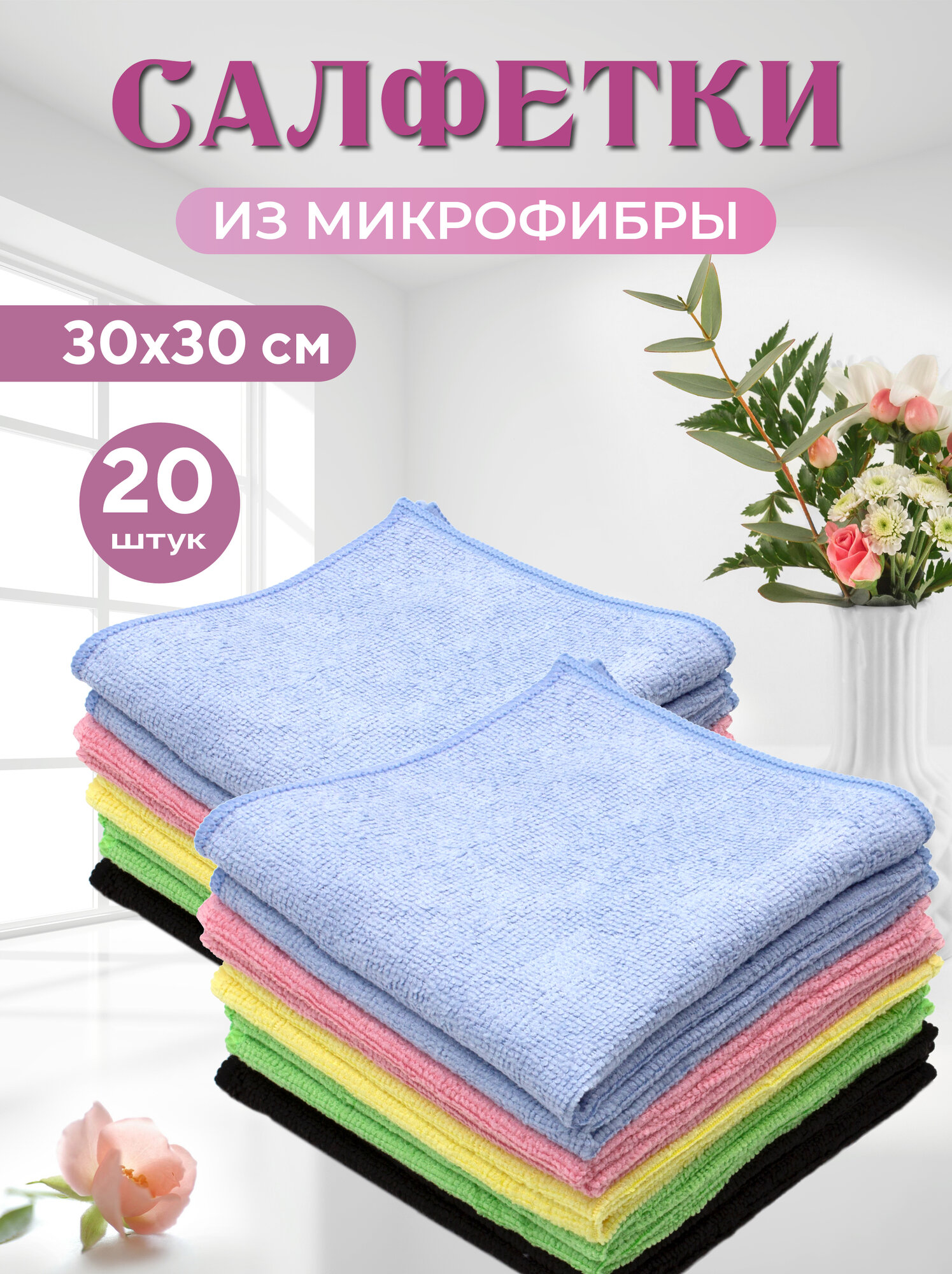 Отзывы на Салфетка для уборки из микрофибры, набор 20 штук, 30х30 см, 220 гр/м2, 5 цветов Optiline