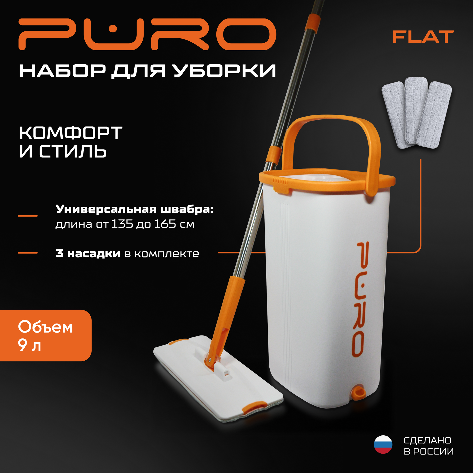 Комплект для уборки, швабра с ведром, отжимом PURO FLAT MOP, черный