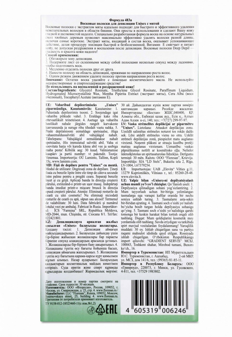 Восковые полоски для депиляции Unisex с мятой Флоресан 20 полосок информация:
