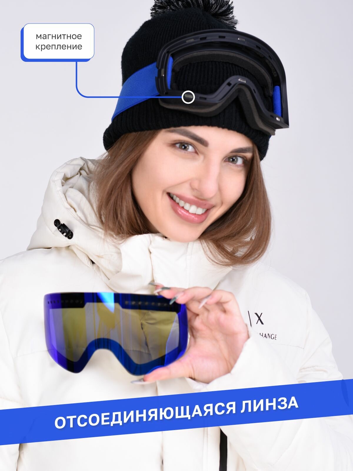 Маска горнолыжная с широким кругом обзора, со съёмной линзой на магнитах, синий информация: