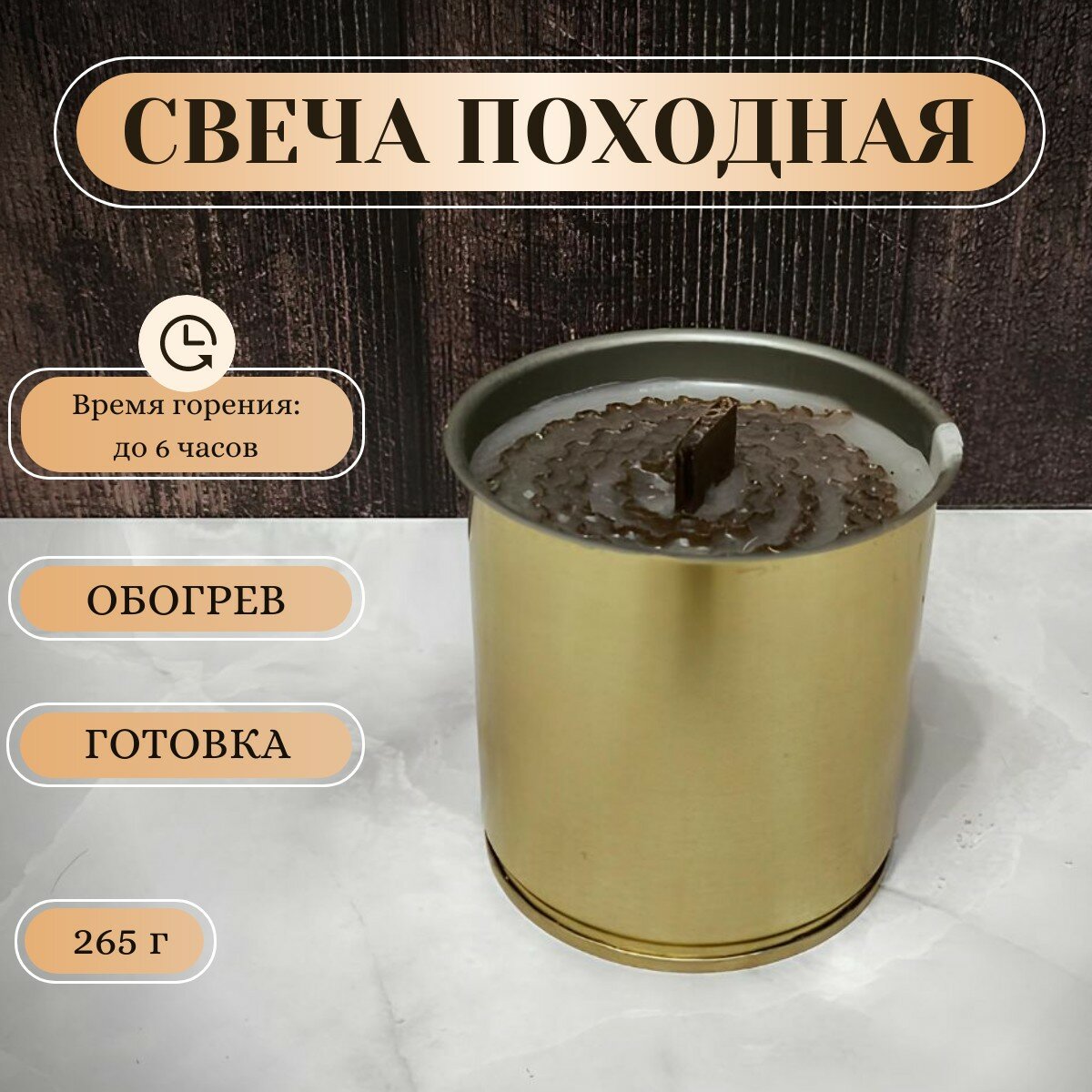 Свеча походная (туристическая, уличная, блиндажная, окопная) 265 грамм. Высота 80 мм. Диаметр 78 мм. 1 штука. информация: