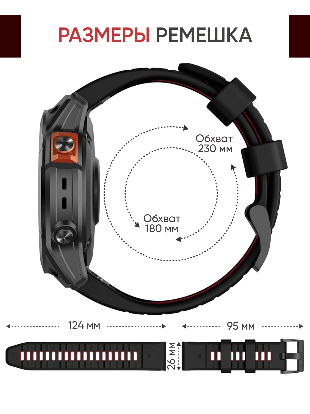 Ремешок силиконовый 26 мм для часов Garmin черно-красный. Для Garmin Fenix 7X Pro, 6X Pro, Tactix и др. 1 890 ₽