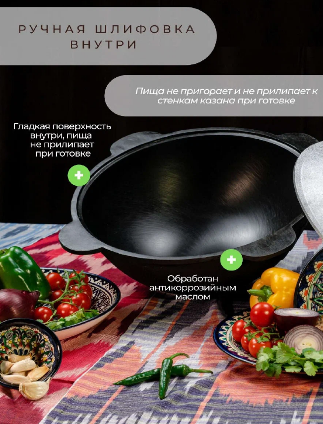 Казан чугунный узбекский с крышкой с плоским дном 6 литров информация: