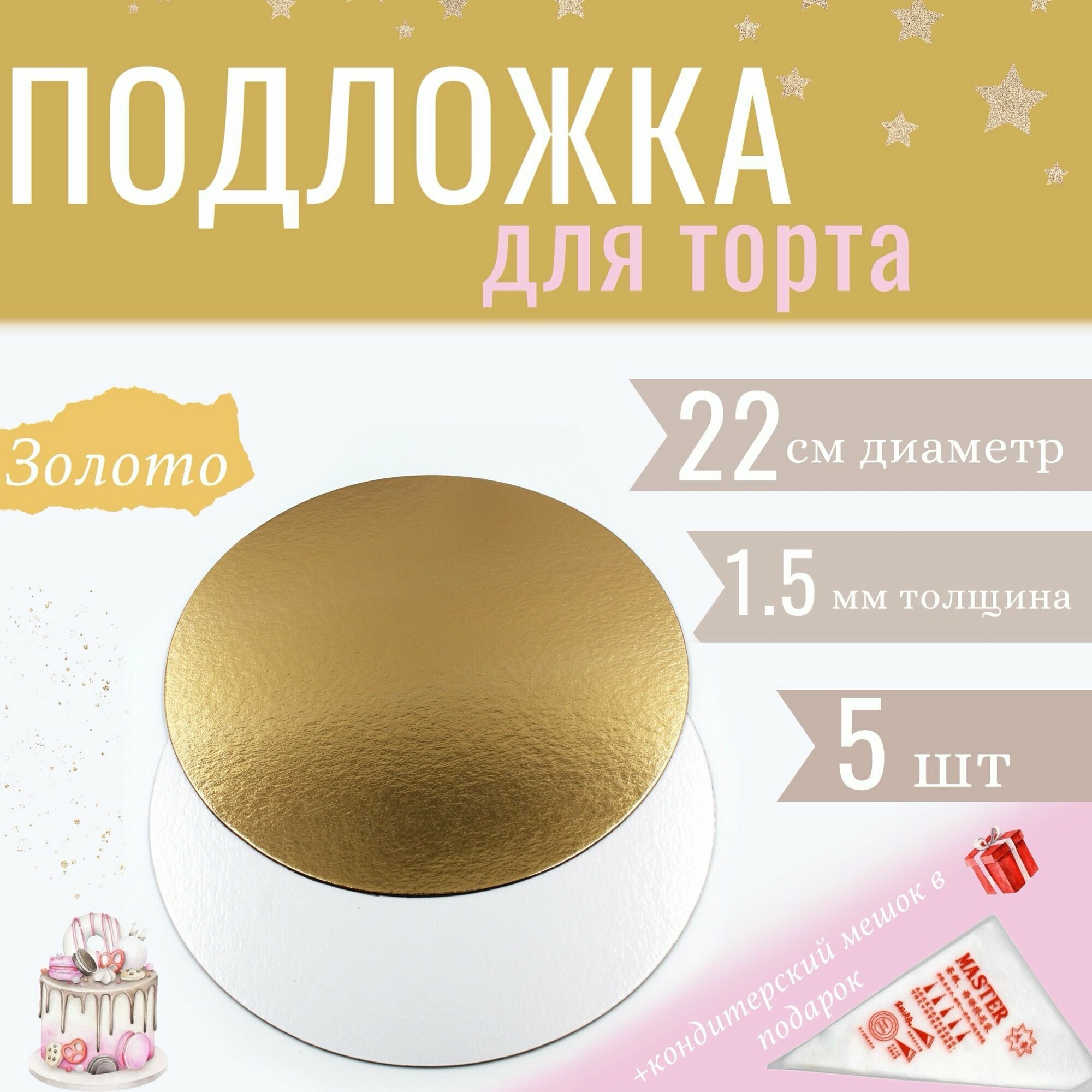 Отзывы на Подложка d 22см, h 1.5мм, 5шт, золото/белый жемчуг, двусторонняя для торта, пирожных, десертов / кондитерская круглая, усиленная крепкая 22 см