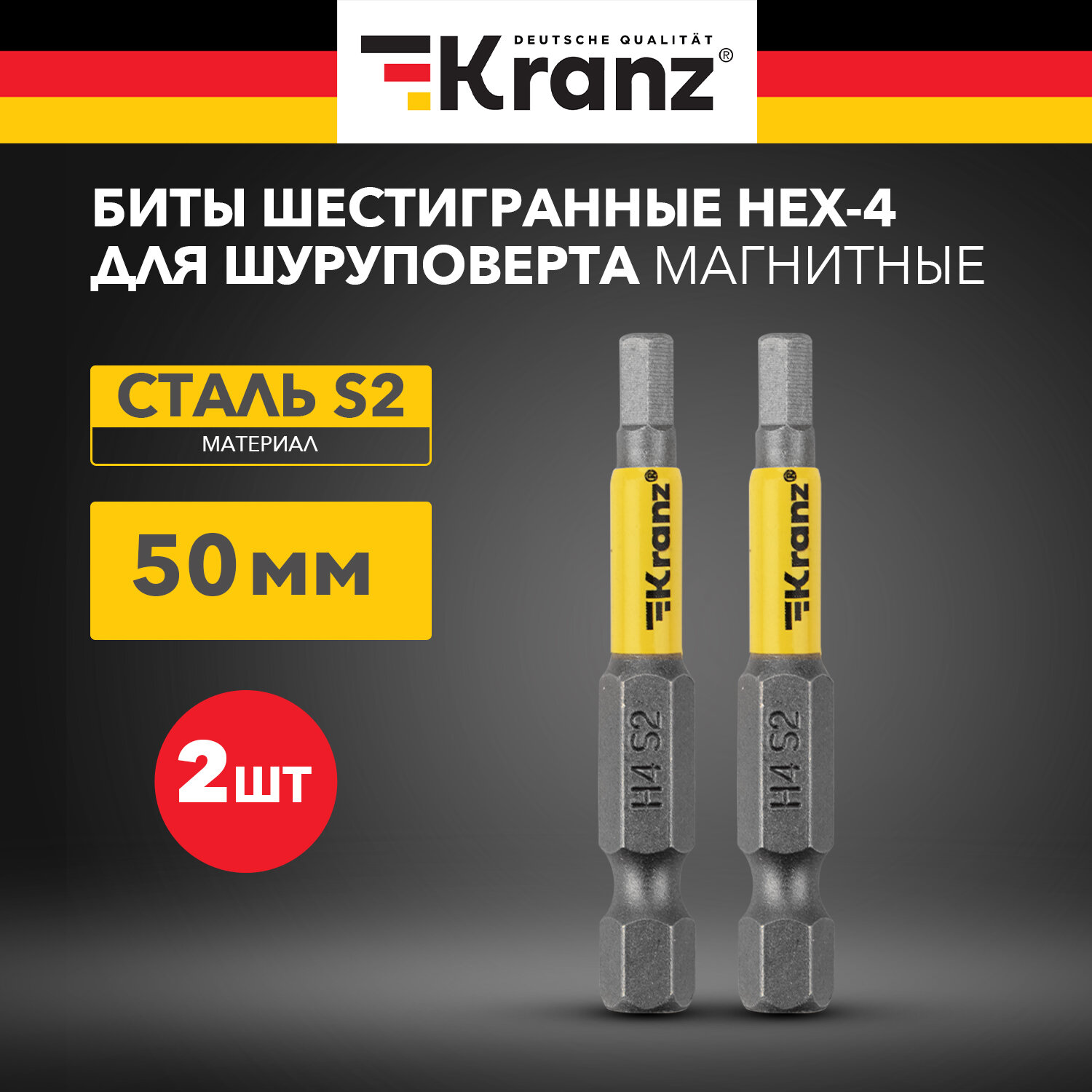 Бита износостойкая шестигранная для шуруповерта KRANZ с магнитным наконечником HEX4х50 мм, 2 штуки информация:
