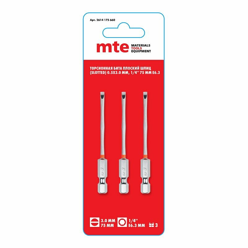 Бита с профилем Slotted (шлиц) SL 0,5X3,0, длина 75 мм, хвостовик E6,3 мм, торсионная, MTE (3 шт) информация: