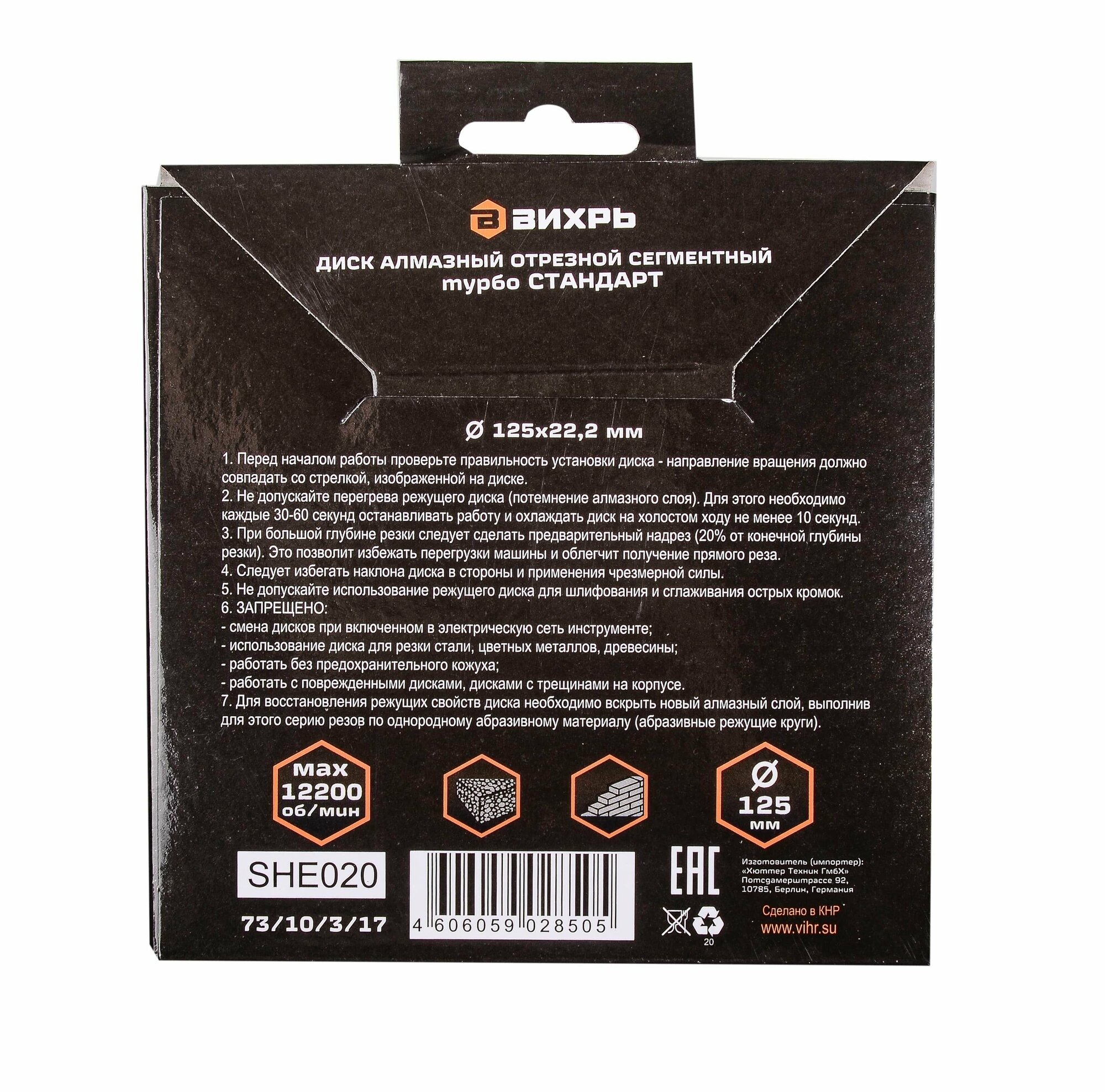 | Дополнительная информация | Диск алмазный сегментный отрезной 125 х 22,2 мм «сухая резка» Вихрь СТАНДАРТ алмазный диск для болгарки (УШМ), для штробореза 73/10/3/17 |