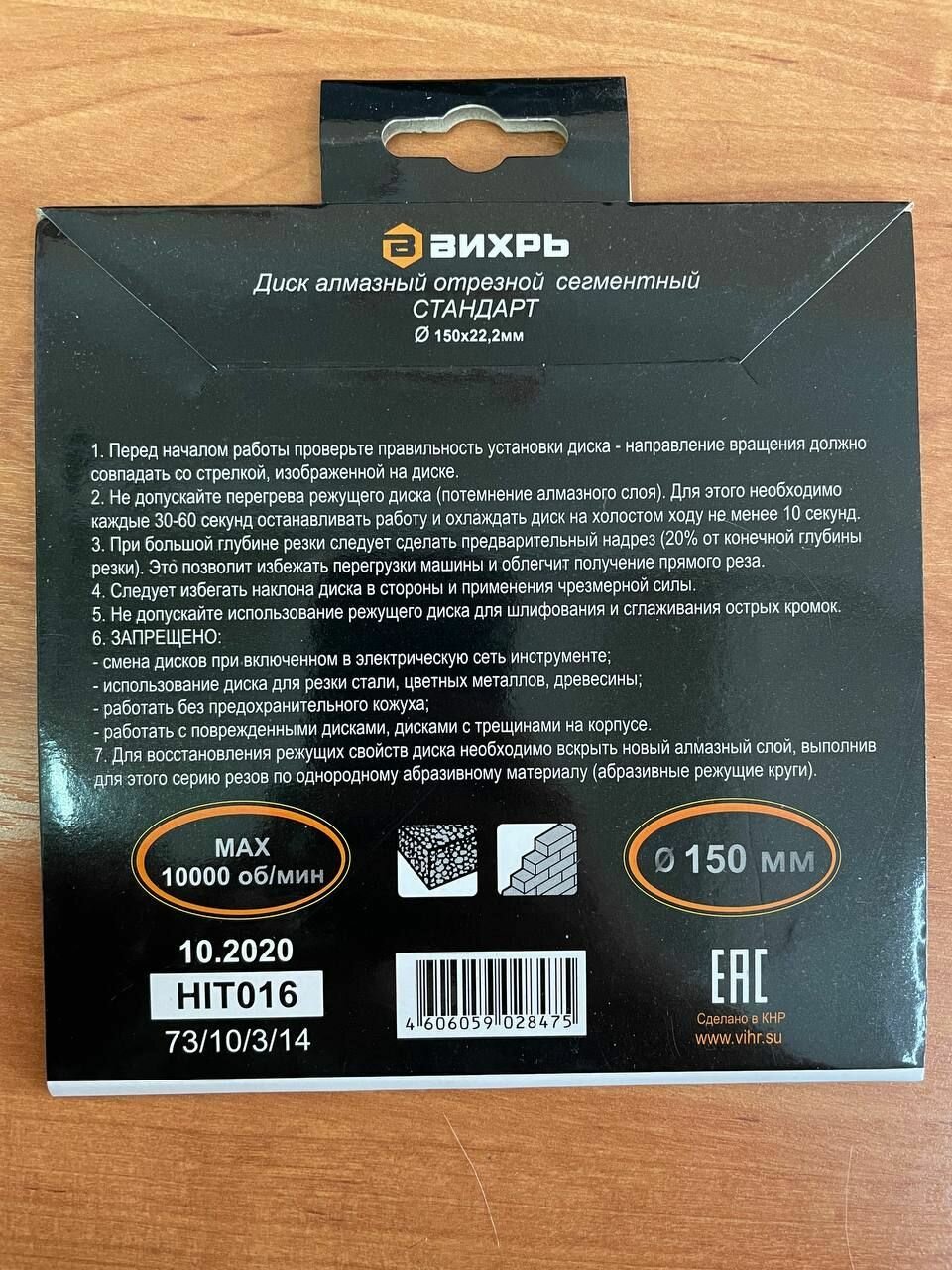 Отзывы на Диск алмазный 150х22,2мм стандарт //отрезной, сегментный, сухая резка вихрь