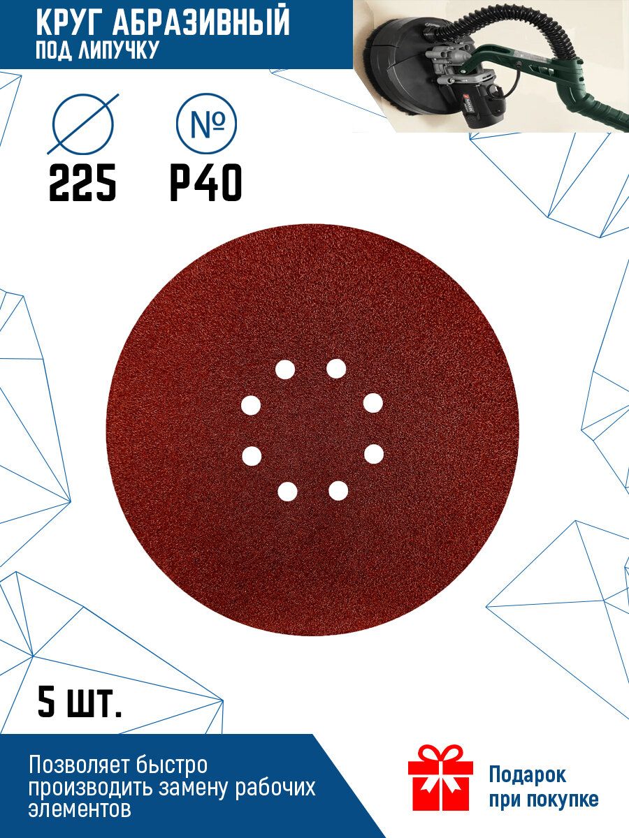 Шлифовальный круг 225 мм. на липучке, 5 шт, P40, 8 отверстий, для шлифовальной машинки Жираф информация: