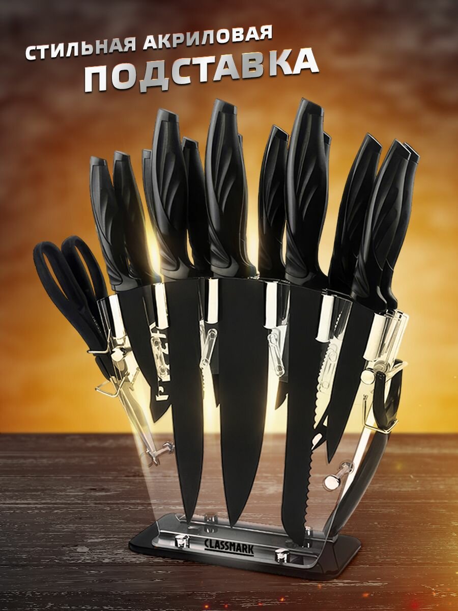 Отзывы на Ножи кухонные Classmark с подставкой, нержавеющая сталь, 17 предметов в упаковке, универсальные, ножницы и точилка, для мяса и овощей, черный