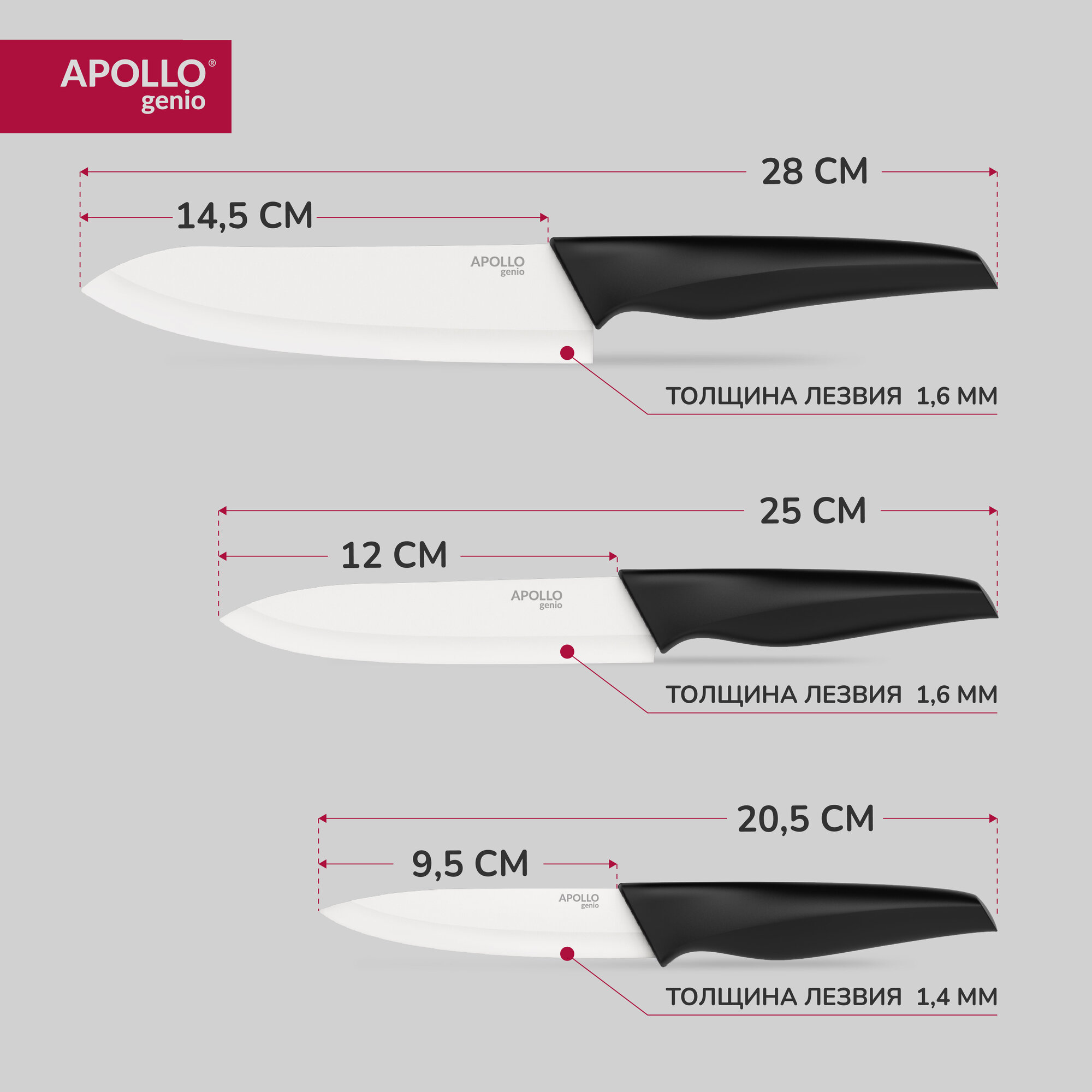 Набор кухонных ножей с антикоррозийным покрытием лезвий APOLLO Genio "Vertex", 3 предмета