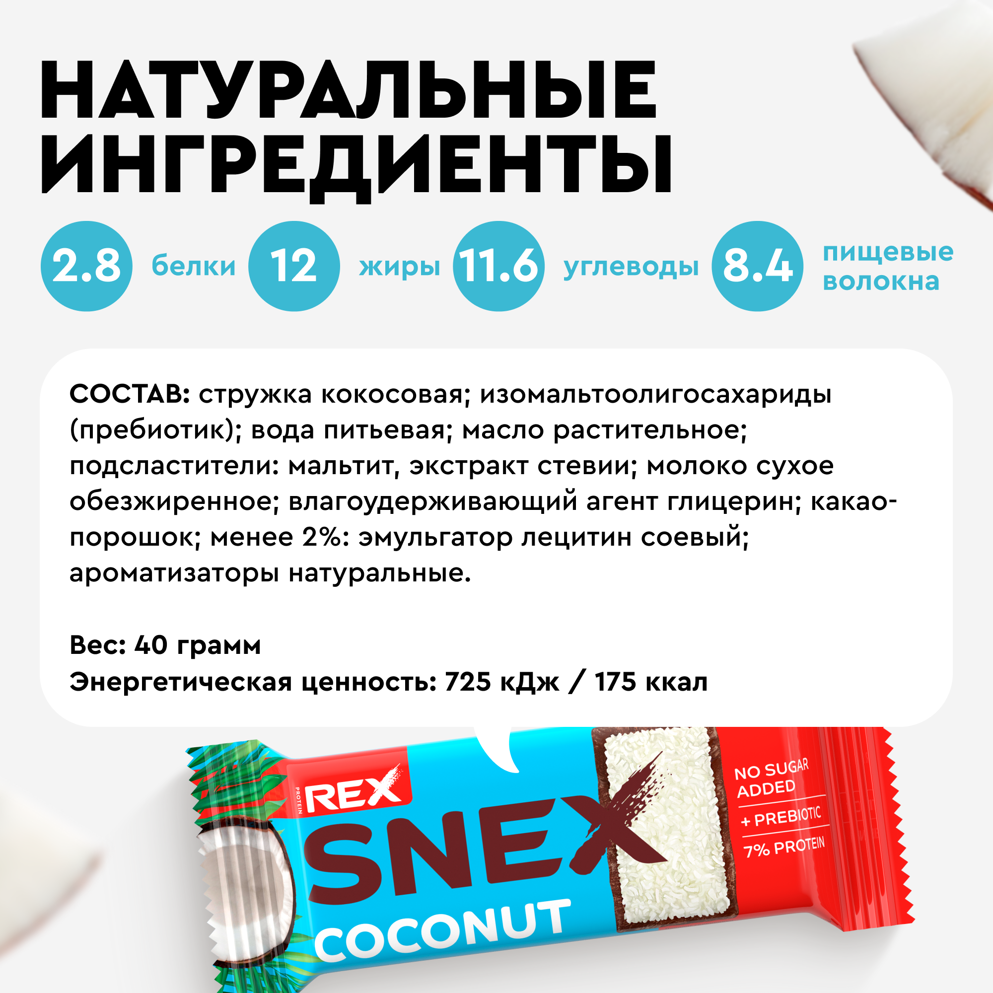 Протеиновые батончики ProteinRex Snex Кокос 12шт без сахара, 193 ккал десерт, спортивное питание, ПП еда, спортивные батончики информация: