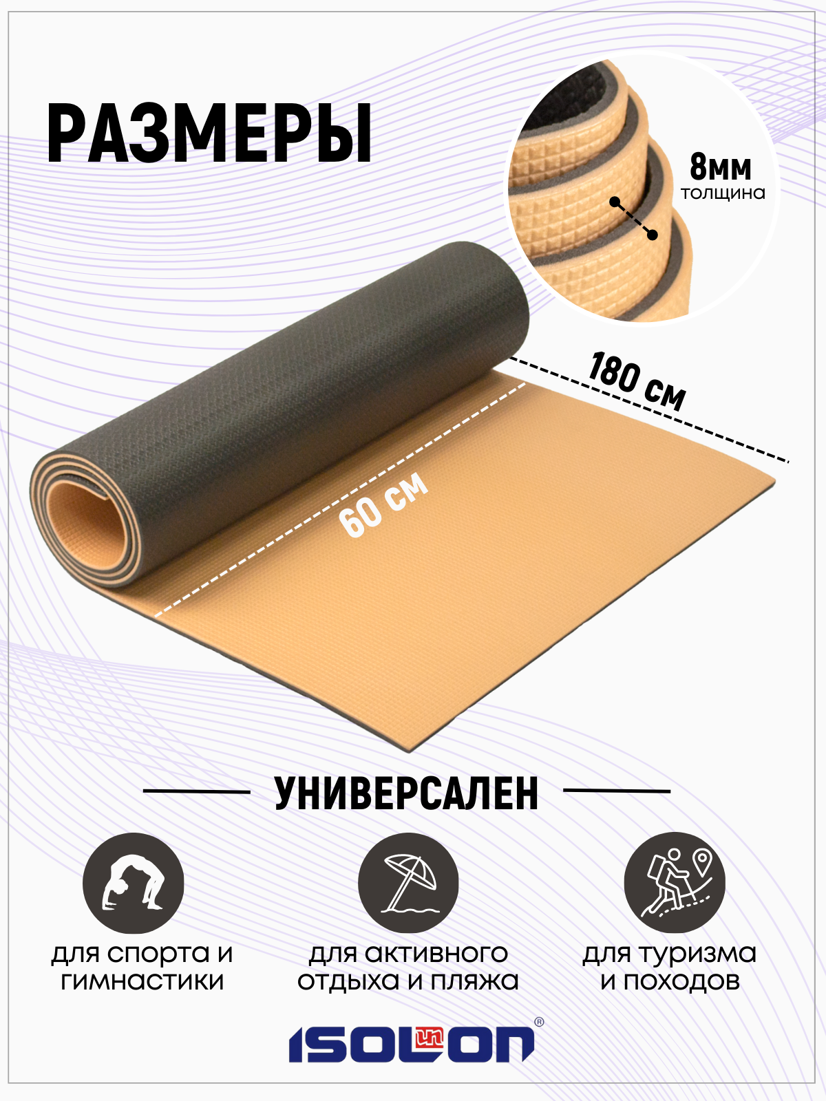 Коврик спортивный для фитнеса и йоги Спорт Универсал 8, 1800х600х8 лавандовый/серый 683 ₽