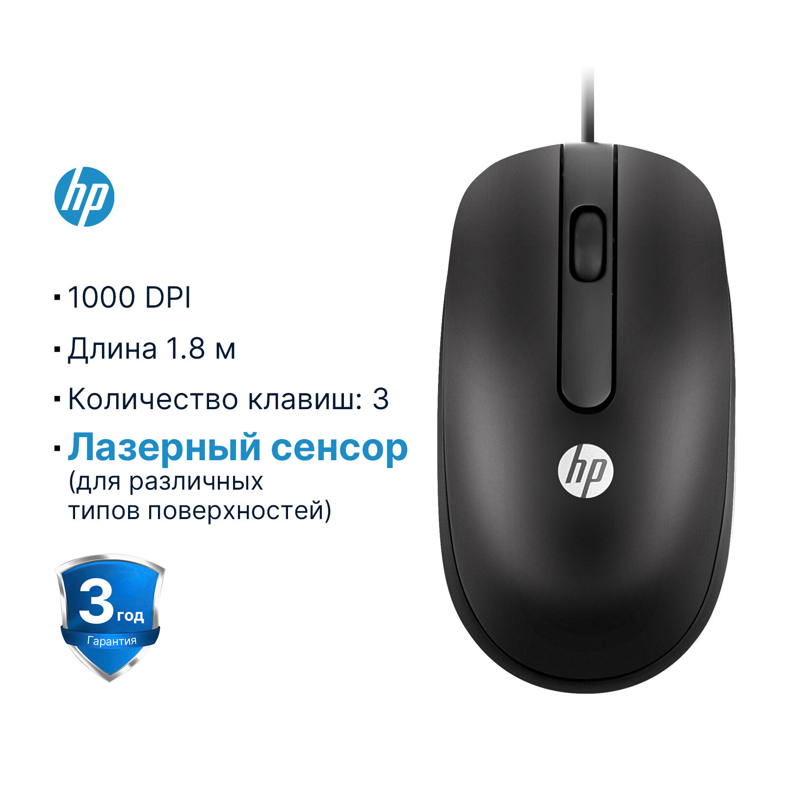Мышь компьютерная проводная HP MSU1158,3 кнопки,1000 dpi,черная,3D,1.8 м,Лазерный сенсор информация:
