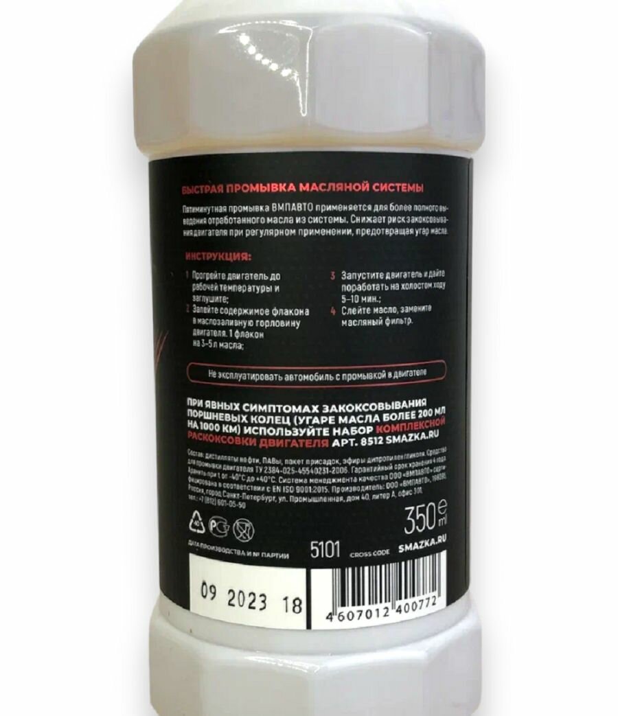 | Способ применения | алить содержимое флакона в маслозаливную горловину двигателя, прогретого до рабочей температуры. Запустить двигатель и дать поработать на холостом ходу 5-10 минут. Слить промывку вместе с маслом, заменить масляный фильтр. 1 флакон промывки на 4 литра масла. Не рекомендуется эксплуатировать автомобиль, когда промывка находится в системе. |