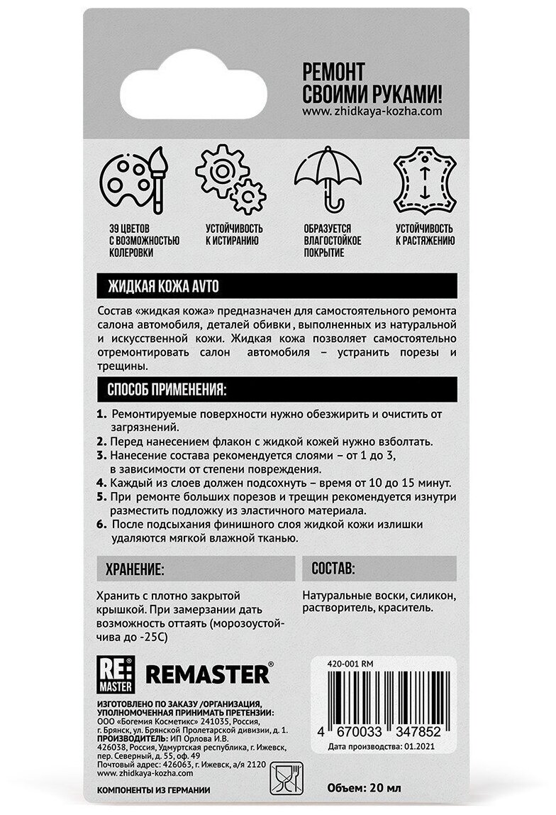Жидкая кожа Авто для ремонта салона автомобиля ReMaster Auto 20 мл Черный информация: